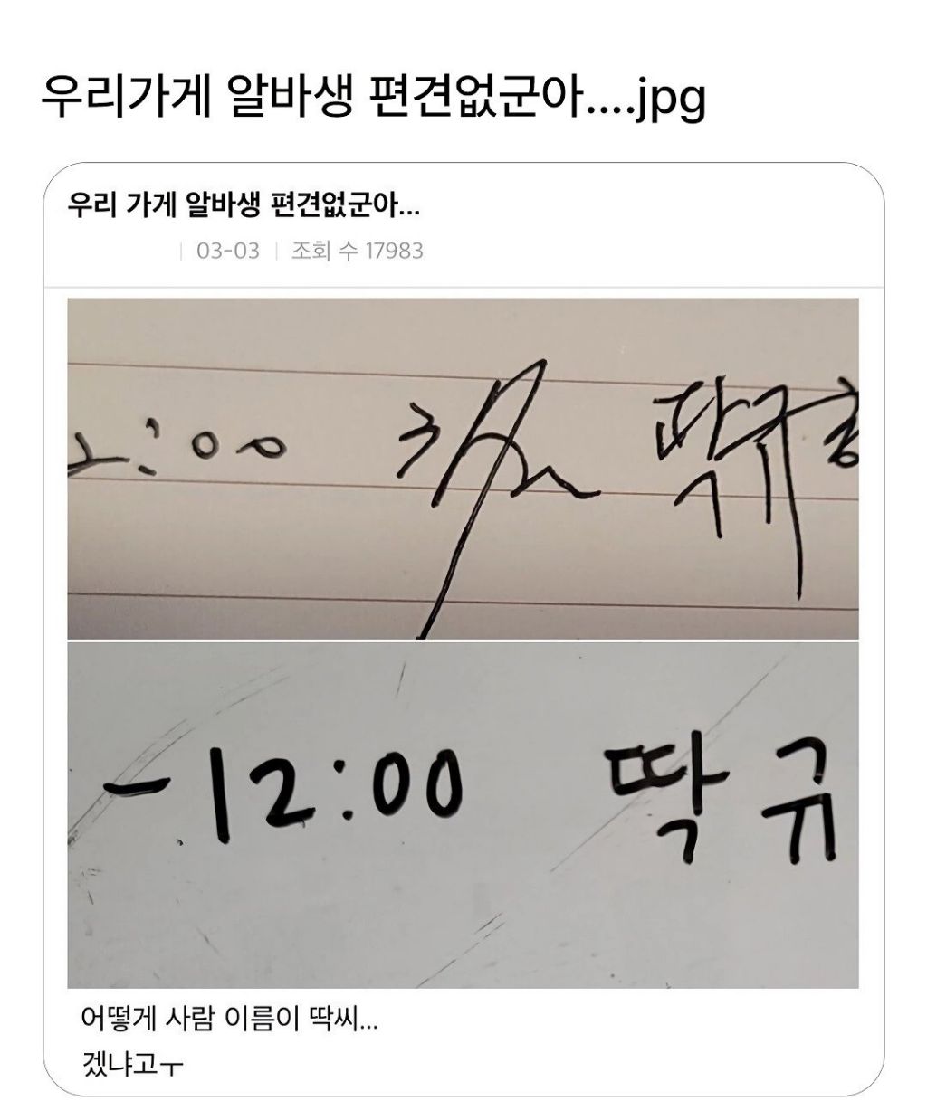 이종격투기 편견 없는 알바생 작성시간25.06.05|조회수19,098 목록 댓글 9 글자크기 작게가 글자크기 크게가 다음검색 현재 게시글 추가 기능 열기 북마크 공유하기 신고 센터로 신고 댓글 9 댓글 리스트 작성시간 25.06.05 팍규? fuxx you? 작성시간 25.06.05 곽규현 형?? 작성시간 25.06.05 왈씨도 있던데 ㅋ 작성시간 25.06.05 곽씨네 작성시간 25.06.05 못알아볼 정도로 악필이네... 카페 방문해 더 많은 댓글 만나기!
