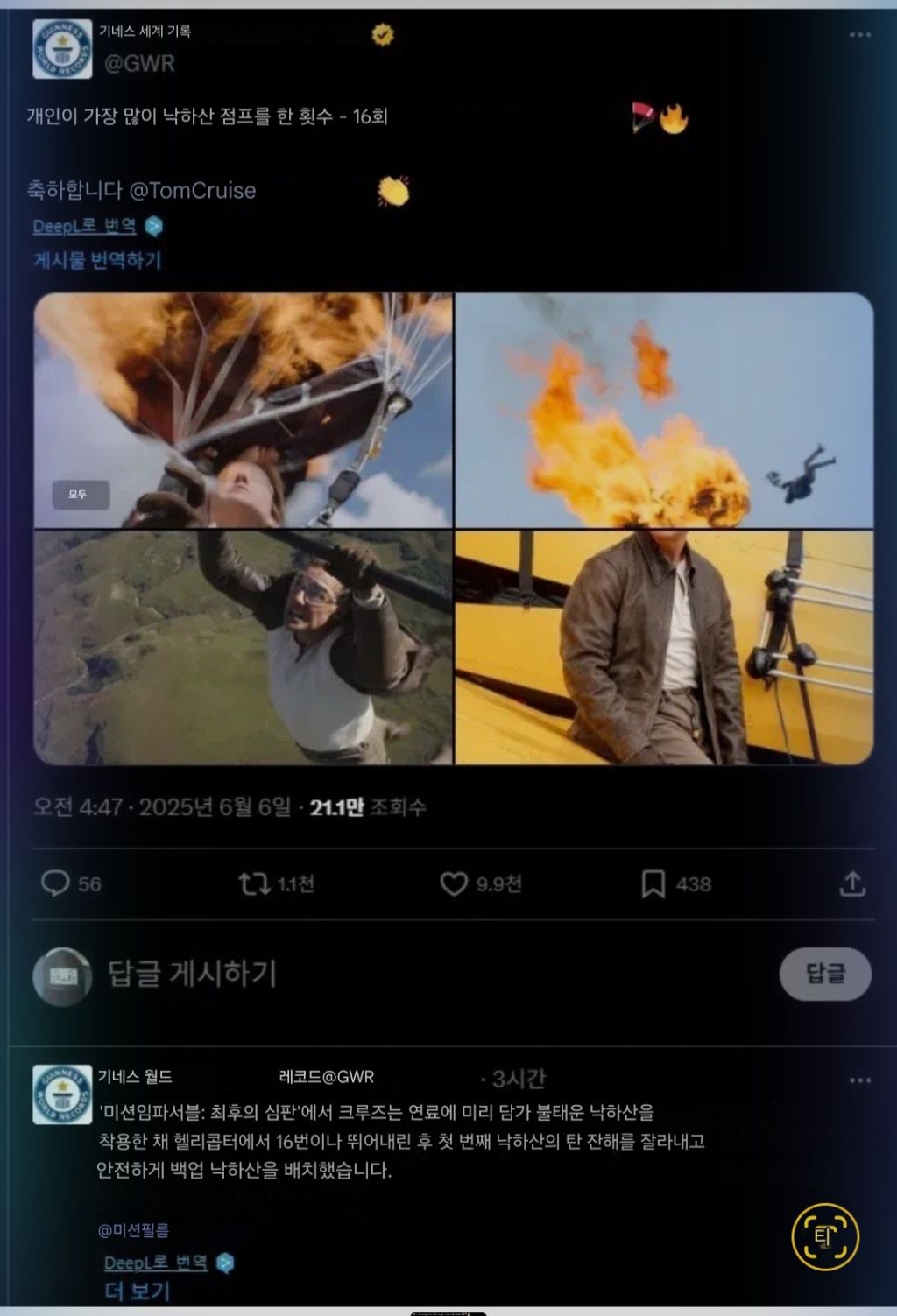 작성시간 25.06.14 파이널 레코닝 재밌게 봤는데 가슴 쫄려서...흑흑..탐 크루즈 오래 보고 싶어요..