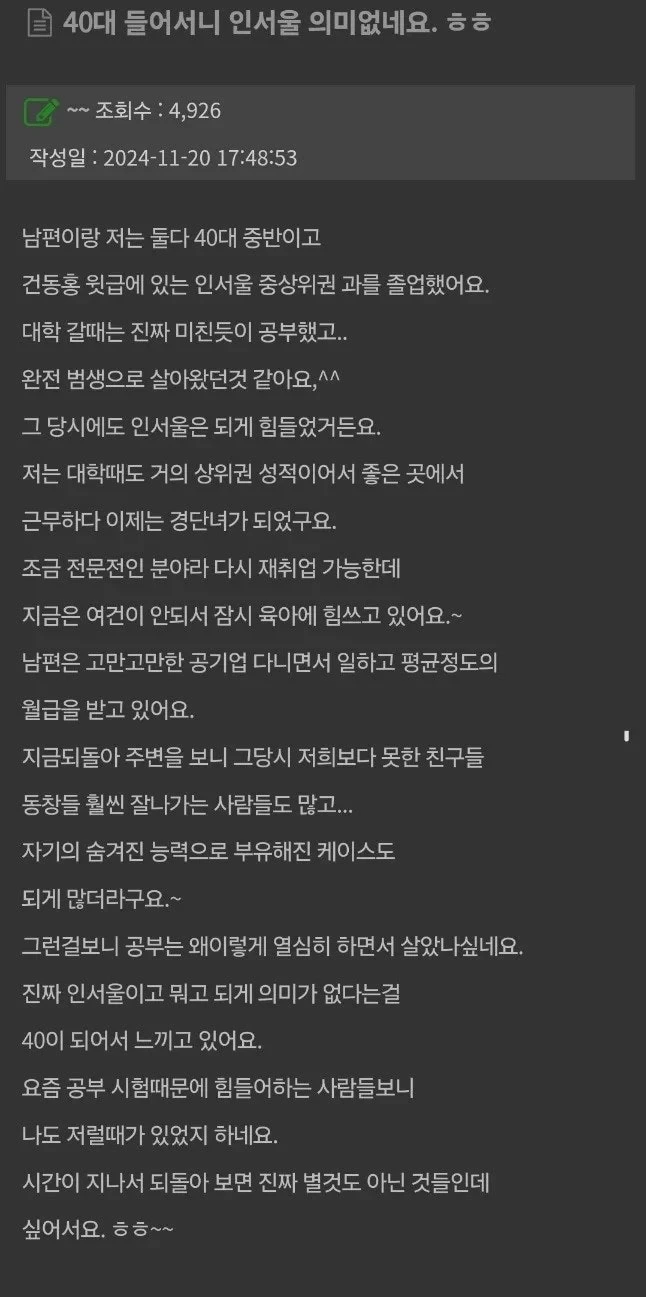 작성시간 25.06.18 학벌좋으면 직장생활이든 사교생활이든 새로운 사람만날때마다 나를 크게 증명하지 않아도