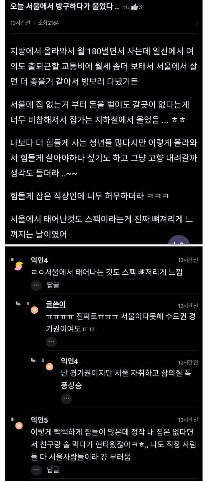 작성시간 25.06.20 뭘 하길래 180을 버는거야 그냥 고향 내려가는게 낫지