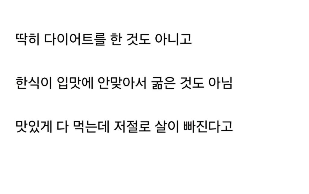 작성시간 25.06.25 외국 음식에 비해 건강식인 것은 맞지만 한국도 비만 인구가 점점 늘어나는 건 불 규칙적인 식사와 함께 스트레스 때문입니다. 정말 아무 것도 않해도 몇달 사이에 10kg 이상 빠질때가 있는데, 적은 스트레스와 규칙적인 식사를 할때였고 일부러 맞춘 것도 아니었어요. 10시쯤 자고 일어나 일하고, 식사 제시간에 먹고, 스트레스에 찌들지 않고 사니, 그냥 조금씩 빠짐.