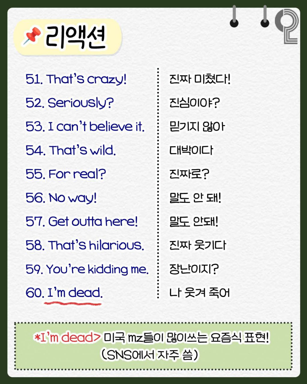 이종격투기 미국인들이 입에 달고 사는 영어표현 100 작성시간25.06.27|조회수22,864 목록 댓글 65 글자크기 작게가 글자크기 크게가 펌 다음검색 현재 게시글 추가 기능 열기 북마크 공유하기 신고 센터로 신고 댓글 65 댓글 리스트 작성시간 25.06.28 WTF이 없다니…ㅋ 작성시간 25.06.29 ㅇㅇ 작성시간 25.06.29 asap 작성시간 25.07.01 영어표현 100 작성시간 25.10.09 미국인 자주쓰는 영어표현 100 카페 방문해 더 많은 댓글 만나기!