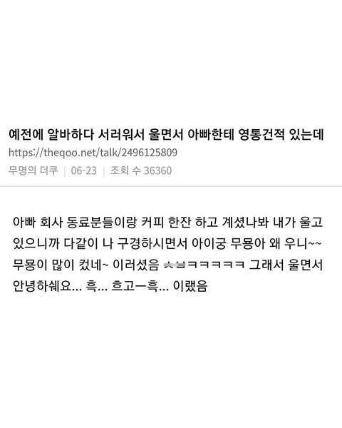 작성시간 25.07.01 ㅋㅋㅋㅋㅋㅋㅋㅋㅋㅋㅋㅋㅋㅋㅋ 어렸을 때 인사 안하면 큰일 나는 줄 알고 엉엉 울면서도 동네에서 어른들께 다 인사하고 다녔죠.. 지금 생각하니 짠하고 귀엽네.. ㅎㅎ