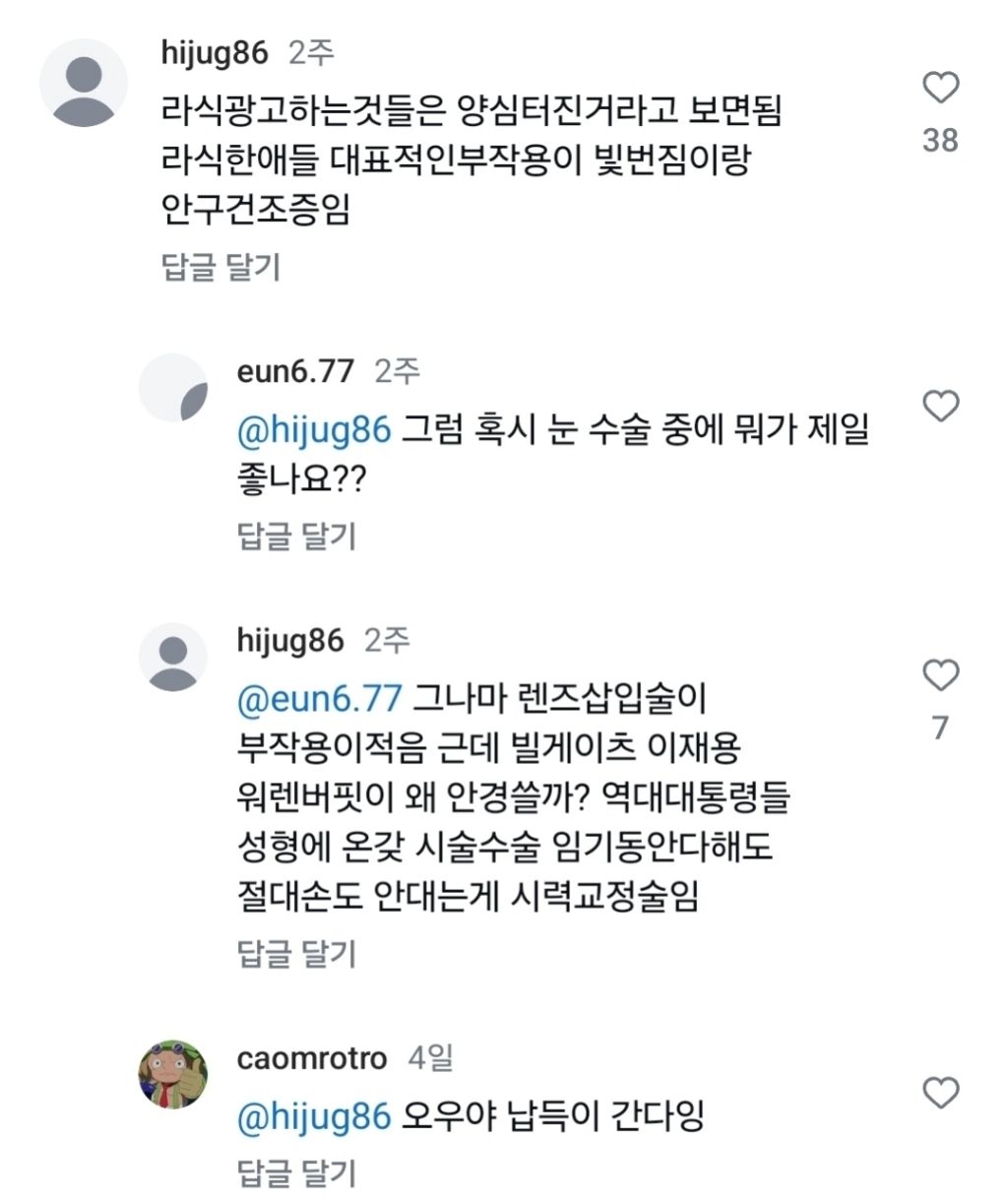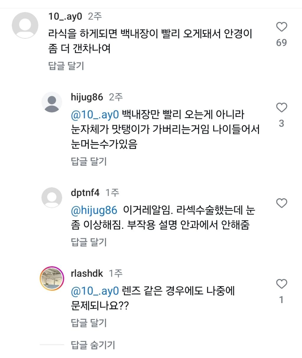 작성시간 25.07.05 눈 수술이라 무서워서 안했는데, 해볼걸 하는 후회가 있네요 지금해봤자 몇 년 뒤엔 노안이 올 수 있으니 이제는 의사가 말리네요