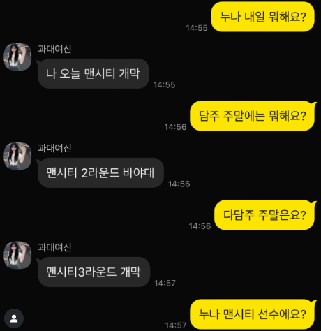 이종격투기 누나 내일 뭐해요? 작성시간25.09.05|조회수10,433 목록 댓글 3 글자크기 작게가 글자크기 크게가 다음검색 현재 게시글 추가 기능 열기 북마크 공유하기 신고 센터로 신고 댓글 3 댓글 리스트 작성시간 25.09.05 니가 싫은거지 좋으면 같이 보겠지 작성시간 25.09.05 ??? : 누나 맨시티 경기 같이봐요.누나 : 맹구로 바꿈. ㅅㄱㅇ 답댓글 작성시간 25.09.05 ㅋㅋㅋ 갑자기 맨유팬 전향 카페 방문해 더 많은 댓글 만나기!