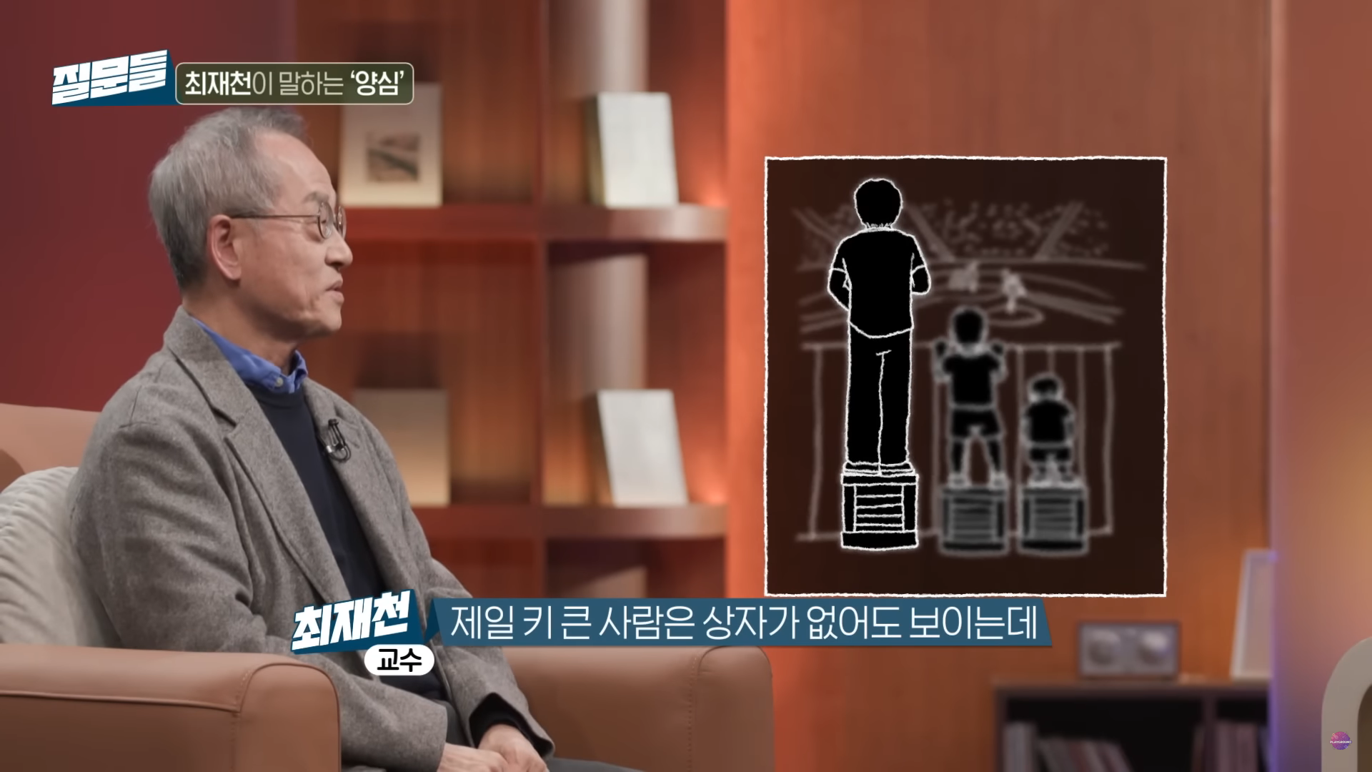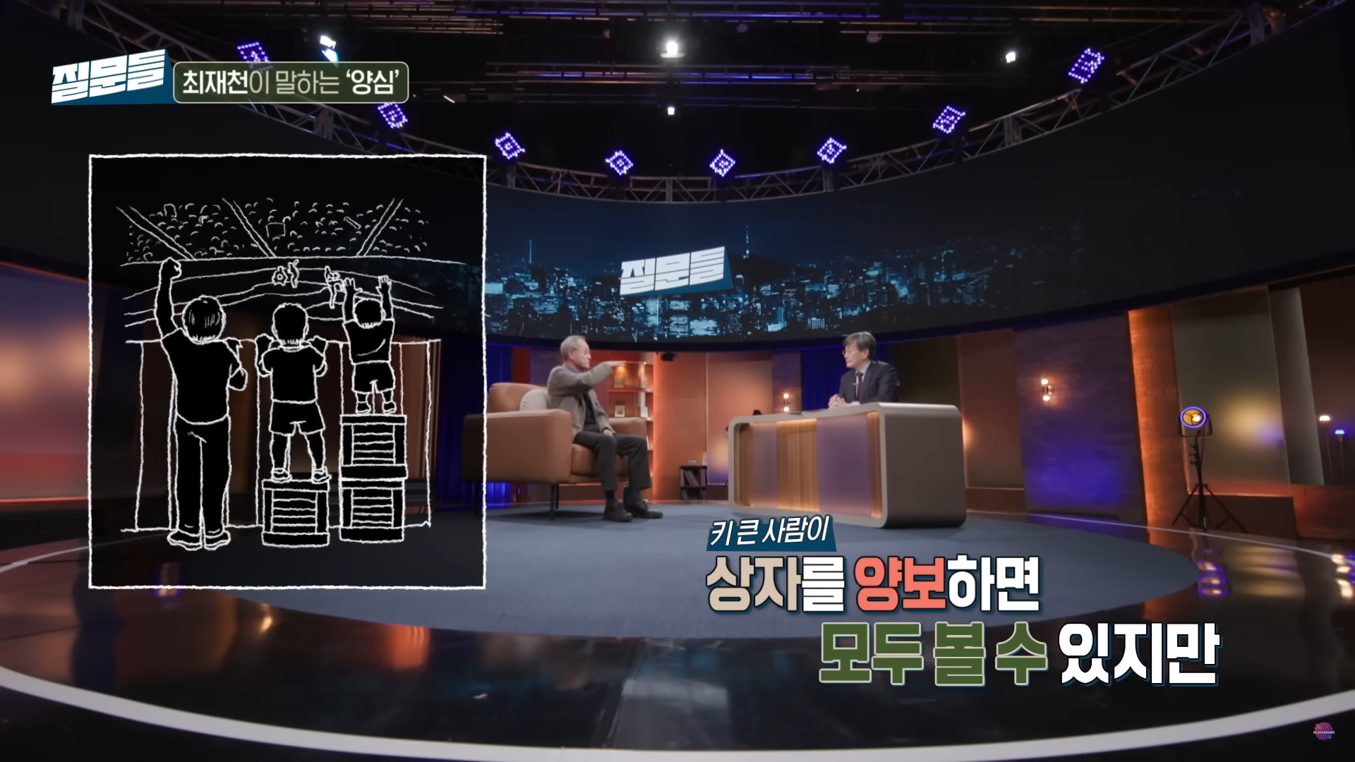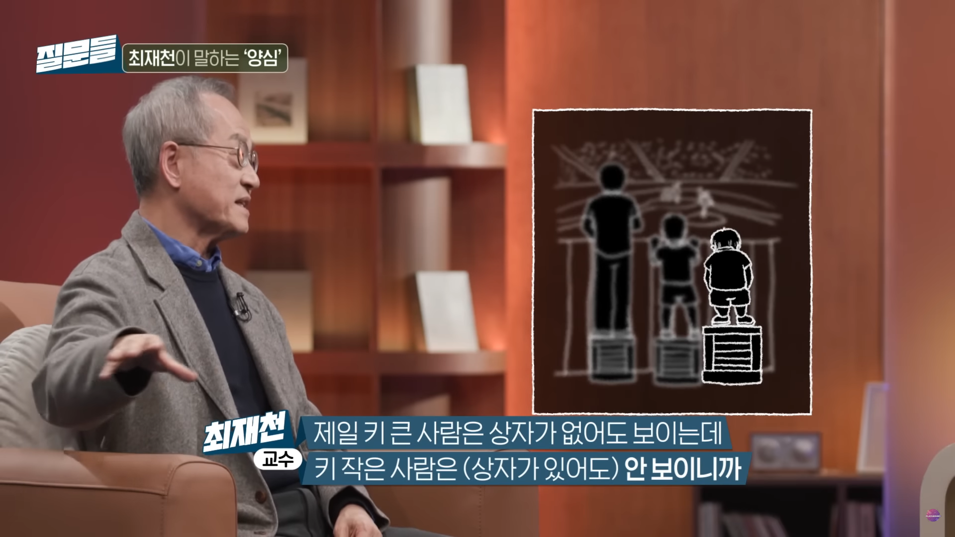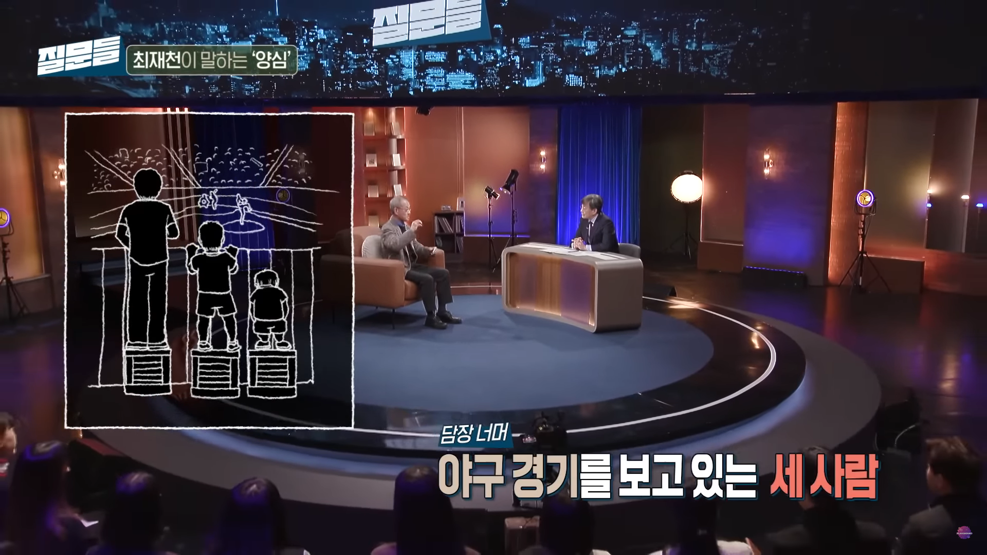 작성시간 25.09.13 근데 저기서 '공정'은 키가 크던 작던 야구장에가서 정식으로 표끊고 들어가서 봐야 하는건데..ㅎㅎㅎ 농담이고 야구장 예시는 좀 잘못되었다고 보는데, 그 사유는 저들의 키가 노력에 의해서 주어진 것이 아니라는데 있습니다. 키가 아니라 어린이집에서 게임을 통해 사탕을 나눠준다고 가정해 봅시다. 열심히 게임에 참여해서 사탕 교환 쿠폰을 많이 얻었는데 유치원 선생님이 이런저런 이유를 들면서 아이들이 가져가는 사탕수를 비슷하게 조정한다면 그게 과연 공정일까요? 제 생각에 인생은 야구장 훔쳐보는 키가 다른 꼬맹이들보다는 사탕을 걸고 게임하는 유치원생들과 더 비슷합니다. 최선배께서 뭔 말씀을 하고자 하시는지는 알겠지만 '공정'을 가장한 '공평'을 우리는 항상 조심해야 합니다.