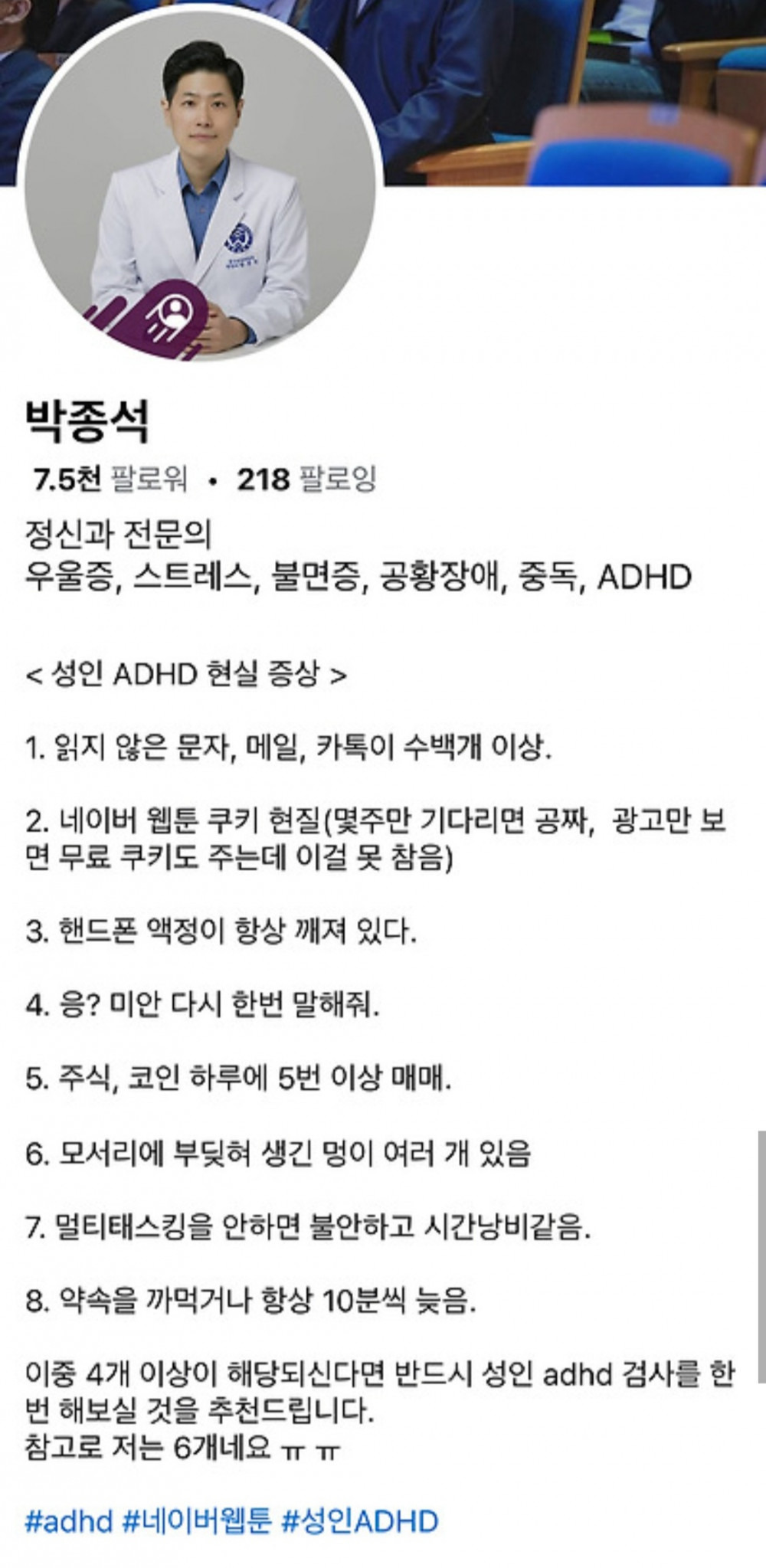 이종격투기 정신과 전문의가 알려주는 성인 ADHD 현실 증상. 작성시간25.09.15|조회수40,768 목록 댓글 47 글자크기 작게가 글자크기 크게가 다음검색 현재 게시글 추가 기능 열기 북마크 공유하기 신고 센터로 신고 댓글 47 댓글 리스트 작성시간 25.09.15 밑에는 시안 회족거리 같네요 무슨 축제인가 작성시간 25.09.16 1번만 해당.. 숫자 모으는 재미가..ㅋㅋㅋ 작성시간 25.09.16 1, 7 휴ㅎ 작성시간 25.09.16 7번만 해당이네 그냥 습관이 더럽게 들린거 같음 작성시간 25.09.16 7번...TV 켜놓고 핸드폰 봄 카페 방문해 더 많은 댓글 만나기!