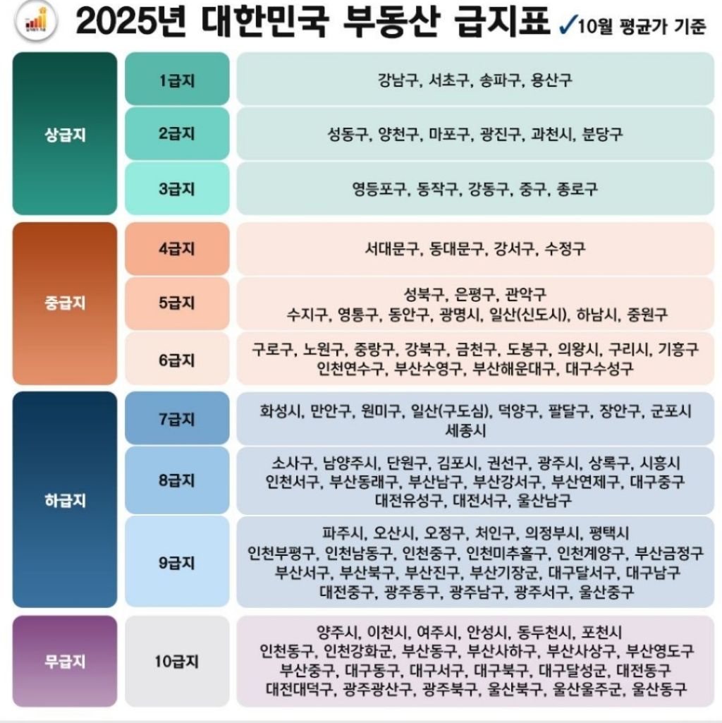 재미로 보는 2025년 대한민국 부동산 급지표 (c f. 10월 평균가 기준) 작성자또다시시작해보자|작성시간25.10.23|조회수4,757 목록 댓글 18 글자크기 작게가 글자크기 크게가 이딴 자료도 있네요 ㅎ내가 만족하고 살면 거기가 상급지죠...재미로 보시고 모두 부자되는 세상을 바랍니다 다음검색 현재 게시글 추가 기능 열기 북마크 공유하기 신고 센터로 신고 댓글 댓글 18 댓글쓰기 답글쓰기 댓글 리스트 작성자시지푸스 | 작성시간 25.10.24 저래두면 강남3구 주민들끼리더 같은 급에 있다고 싸워여 ㅋ 작성자11xx RCN | 작성시간 25.10.24 8급지네?? 진짜 지랄도 대세다... 별게다... 작성자LooksGood | 작성시간 25.10.24 집값으로 본다더니 부산 강서구가 부산진구보다 위라니;;부산진구 지금 신규 분양가 보통 8~9억인데;;; 작성자내가터뜨릴꼬얌 | 작성시간 25.10.24 개같은 자료네요 작성자bogusdang | 작성시간 25.10.25 별~~~~ 댓글 전체보기