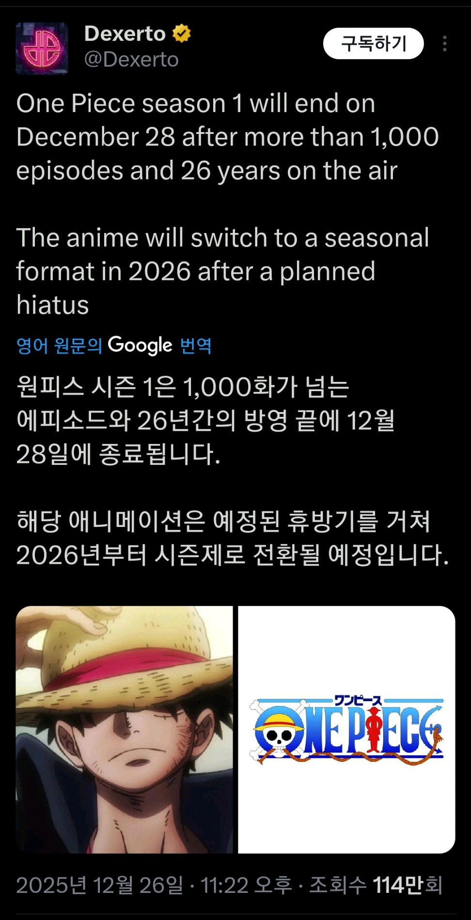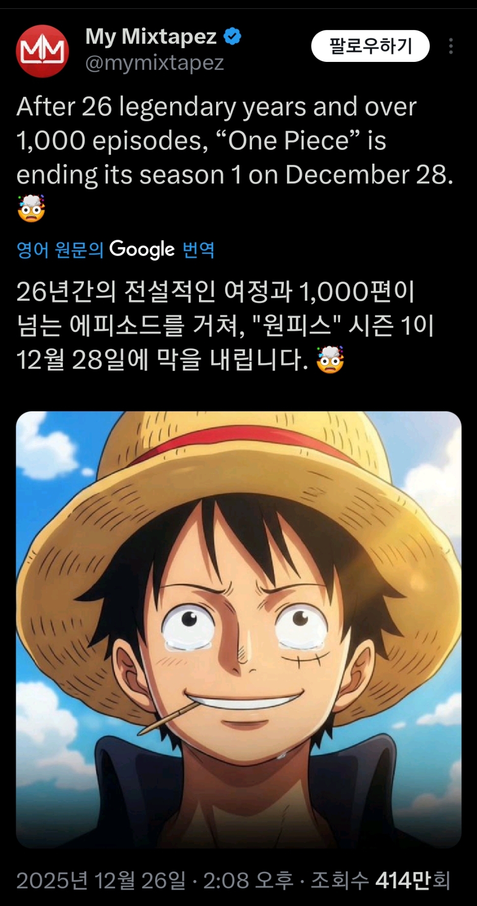 작성시간 25.12.27 원피스 지금 재밌는데...재미없다는 사람들은 안보는 사람들일듯~