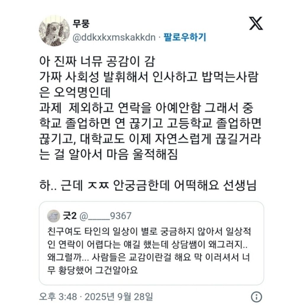 관심결핍이 아니라 관심절약형 인간임 작성자다크토바코|작성시간25.12.29|조회수6,975 목록 댓글 5 글자크기 작게가 글자크기 크게가 다음검색 현재 게시글 추가 기능 열기 북마크 공유하기 신고 센터로 신고 댓글 댓글 5 댓글쓰기 답글쓰기 댓글 리스트 작성자저스트 DO IT | 작성시간 25.12.29 ㅇㅇ 관심없음. 작성자헤비스모커 | 작성시간 25.12.29 운동열심히하는 처자는 뉘신지? 답댓글 작성자내별명은피터아츠 | 작성시간 25.12.29 김도아 작성자숟가락펀치 | 작성시간 25.12.29 비슷한 성향인데 중딩 고딩 대학교 친구 동생들 항상 불알 친구급으로 몇명씩 남음. 좁고 깊게.. 작성자PD 이엉돈 | 작성시간 25.12.29 ㄷㄱ 댓글 전체보기