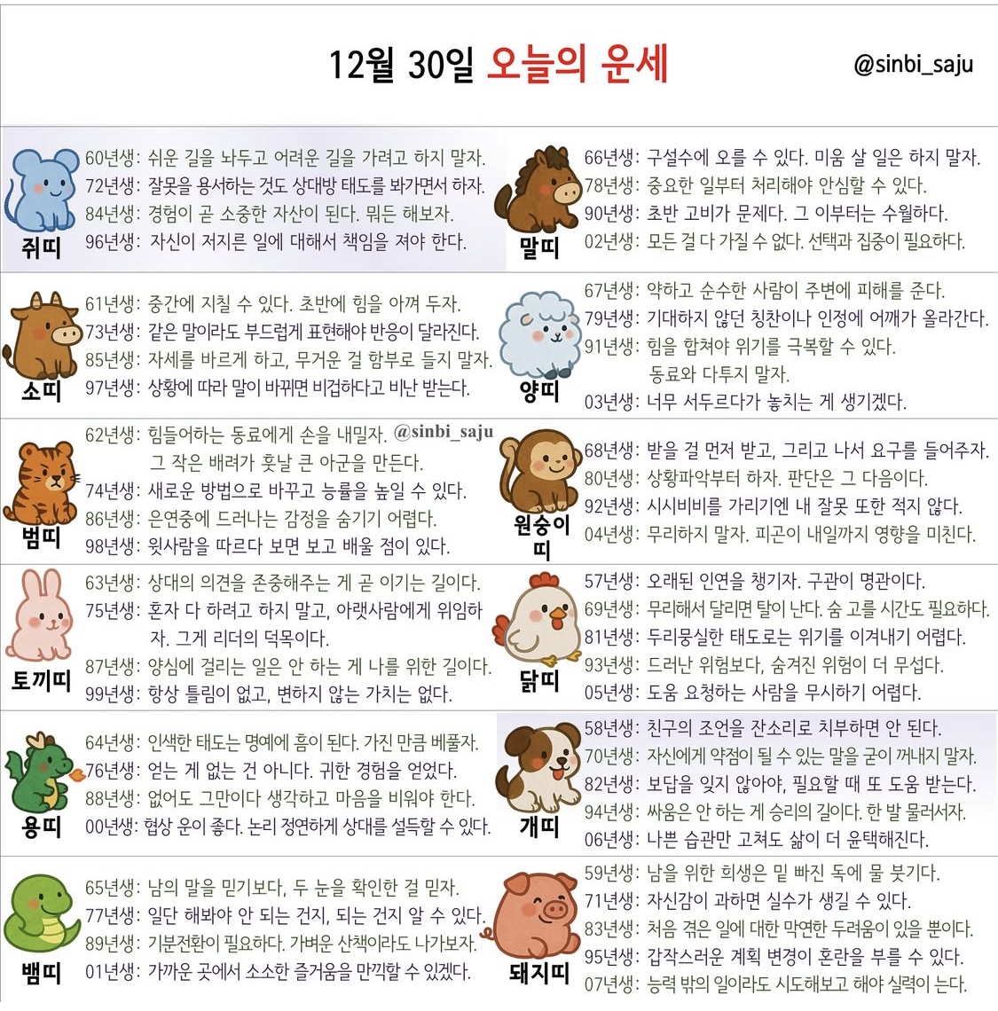 오늘의 운세 작성자Binyoppa|작성시간25.12.30|조회수5,169 목록 댓글 3 글자크기 작게가 글자크기 크게가 다음검색 현재 게시글 추가 기능 열기 북마크 공유하기 신고 센터로 신고 댓글 댓글 3 댓글쓰기 답글쓰기 댓글 리스트 작성자설립 | 작성시간 25.12.30 고맙습니다 작성자이종 khawai | 작성시간 25.12.30 감사합니다 작성자DeadlyCoolStyle | 작성시간 25.12.30 매일 잘보고 있습니다 감사합니다 댓글 전체보기