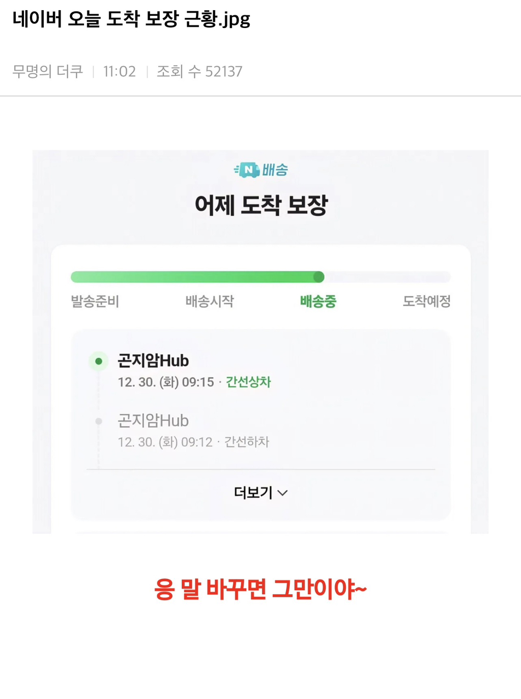 네이버 오늘 도착 보장 근황 작성자손톱달|작성시간25.12.31|조회수12,148 목록 댓글 11 글자크기 작게가 글자크기 크게가 ㅋㅋ그런데 오늘 도착 보장으로 배송 실패하면 포인트 줌 👍🏻 다음검색 현재 게시글 추가 기능 열기 북마크 공유하기 신고 센터로 신고 댓글 댓글 11 댓글쓰기 답글쓰기 댓글 리스트 작성자대하기 | 작성시간 25.12.31 오 포인트주면 개꿀. 답댓글 작성자케인벨라스케즈 | 작성시간 25.12.31 포인트 기한 5일. 답댓글 작성자대하기 | 작성시간 25.12.31 케인벨라스케즈 5일이면 거이 밑장빼기수준인데요 작성자빠러마러 | 작성시간 25.12.31 ㅋㅋㅋㅋㅋㅋㅋㅋ 작성자광빨에기절 | 작성시간 25.12.31 오후 6~8시 사이 도착 이라고 하더니 담날 출근 무렵에 ㅡ.ㅡ 댓글 전체보기