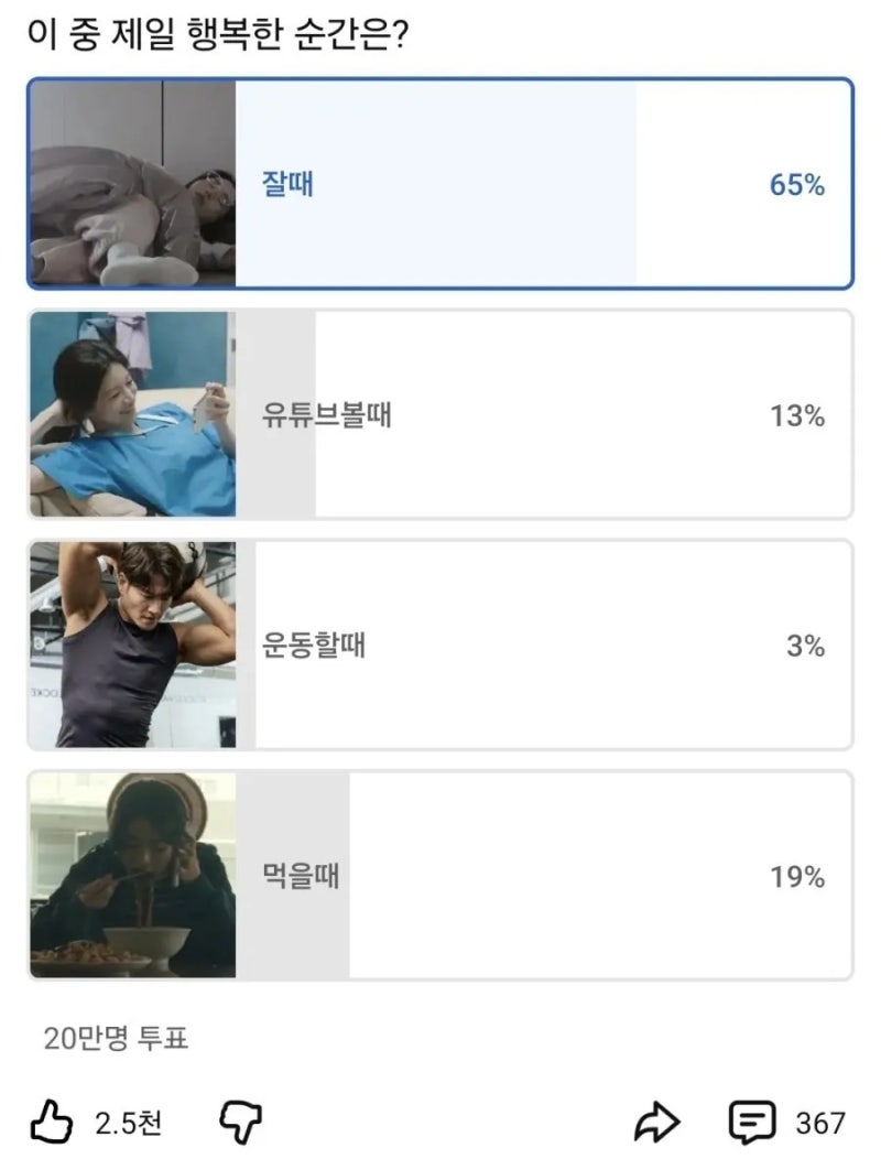 20만명이 투표한 행복한 순간은? 작성자대전아재|작성시간26.01.04|조회수10,340 목록 댓글 19 글자크기 작게가 글자크기 크게가 다음검색 현재 게시글 추가 기능 열기 북마크 공유하기 신고 센터로 신고 댓글 댓글 19 댓글쓰기 답글쓰기 댓글 리스트 작성자조자룡완전좋아 | 작성시간 26.01.05 이종에서 드립쳤는데 그게 먹혔을 때 작성자네가 좋아 | 작성시간 26.01.05 공감. 먹는 재미로 산다지만 자는 순간만큼은 영원을 얻는것 같음. 작성자beckham7 | 작성시간 26.01.05 먹는것보단 자는게 더 행복 작성자검둥개 | 작성시간 26.01.05 잘때 작성자구형포터 | 작성시간 26.01.05 쎅스가 빠지다니 댓글 전체보기