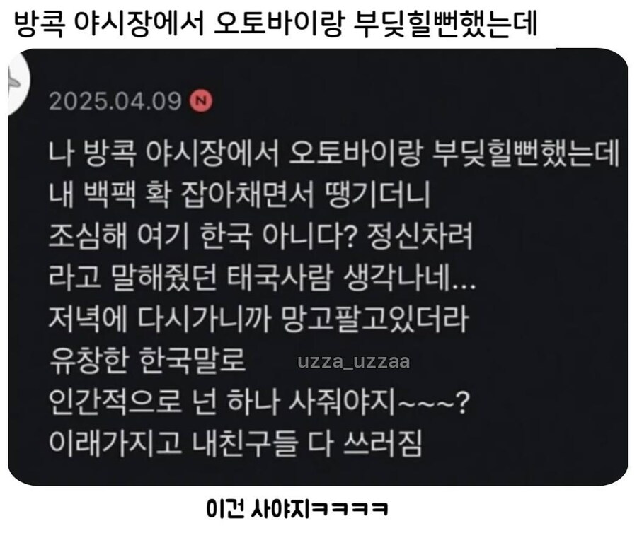 방콕 야시장에서 오도바이랑 부딪힐뻔했는데 작성자정신병환자5|작성시간26.01.06|조회수7,826 목록 댓글 12 글자크기 작게가 글자크기 크게가 ?: 네 목숨값이 겨우 망고 3개값이더냐! 다음검색 현재 게시글 추가 기능 열기 북마크 공유하기 신고 센터로 신고 댓글 댓글 12 댓글쓰기 답글쓰기 댓글 리스트 답댓글 작성자Citihunter | 작성시간 26.01.06 정신병환자5 형님 대체 와이프가 몇명이신데요 작성자uchimata | 작성시간 26.01.06 사줘야겠다 ㅋ 작성자dosdnjs | 작성시간 26.01.06 은인 ㅋㅋㅋㅋㅋㅋ 작성자나그네22 | 작성시간 26.01.06 사야지 이건 ㅋㅋㅋ 작성자어떤 정의 | 작성시간 26.01.06 ㅋㅋㅋㅋㅋㅋㅋㅋㅋㅋㅋㅋㅋㅋㅋㅋㅋㅋ 댓글 전체보기