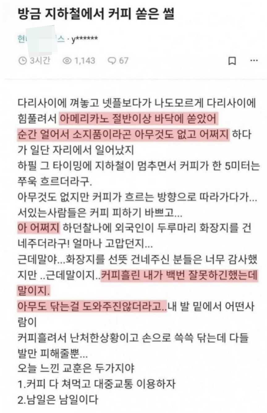작성시간 26.01.22 커피등 마실거 들고 다니는거 극혐