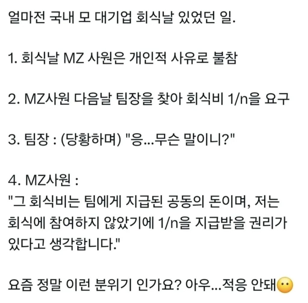 작성시간 26.01.31 절대 손해보는 일이 없는.... 이란 생각이 강하다보니 MZ직원 레파토리가 가끔 뜨는데 비슷한 글 몇번보네요.