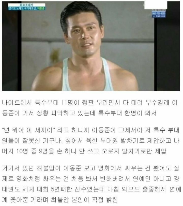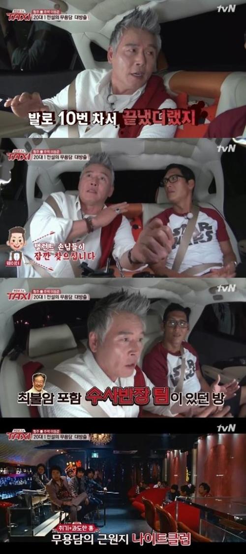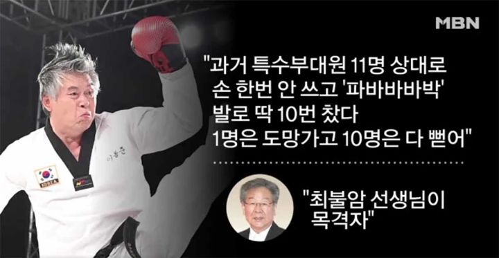 이어 그는 “그 때 내가 11명을 앞에 두고 손 한 번 안 쓰고 발로 10번을 찼다. 그리고 1명이 도망갔다”며 “그후 바로 탤런트 손님들이 찾는다고 해서 갔었다. 그런데 그 자리에 최불암 선배님도 있으셨다. 박수를 쳐주셨다”고 밝혔다.
