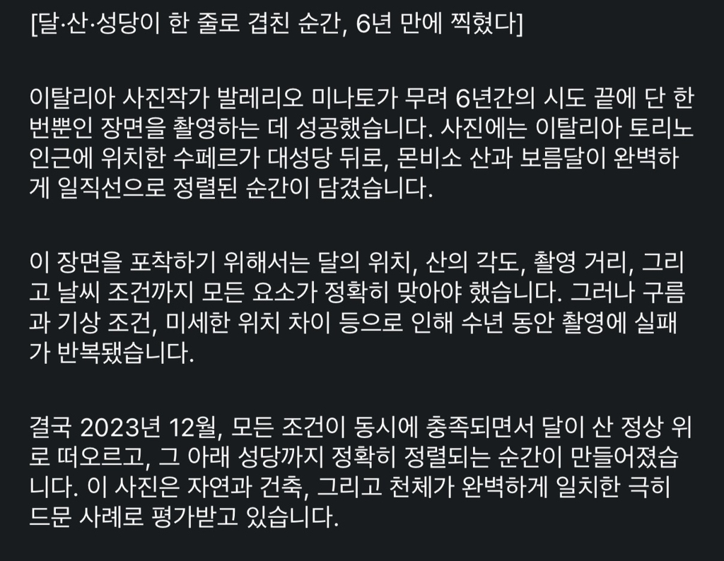 이종격투기 6년이 걸린 사진 한장 작성시간26.02.22|조회수27,203 목록 댓글 9 글자크기 작게가 글자크기 크게가 다음검색 현재 게시글 추가 기능 열기 북마크 공유하기 신고 센터로 신고 댓글 9 댓글 리스트 답댓글 작성시간 26.02.22 “딸깍” 작성시간 26.02.22 작가님 ai로 했으면 편했을건디 작성시간 26.02.22 작성시간 26.02.22 미나토자키 사나도 감탄할 사진 작성시간 26.02.22 보름달 아닌데.. 카페 방문해 더 많은 댓글 만나기!