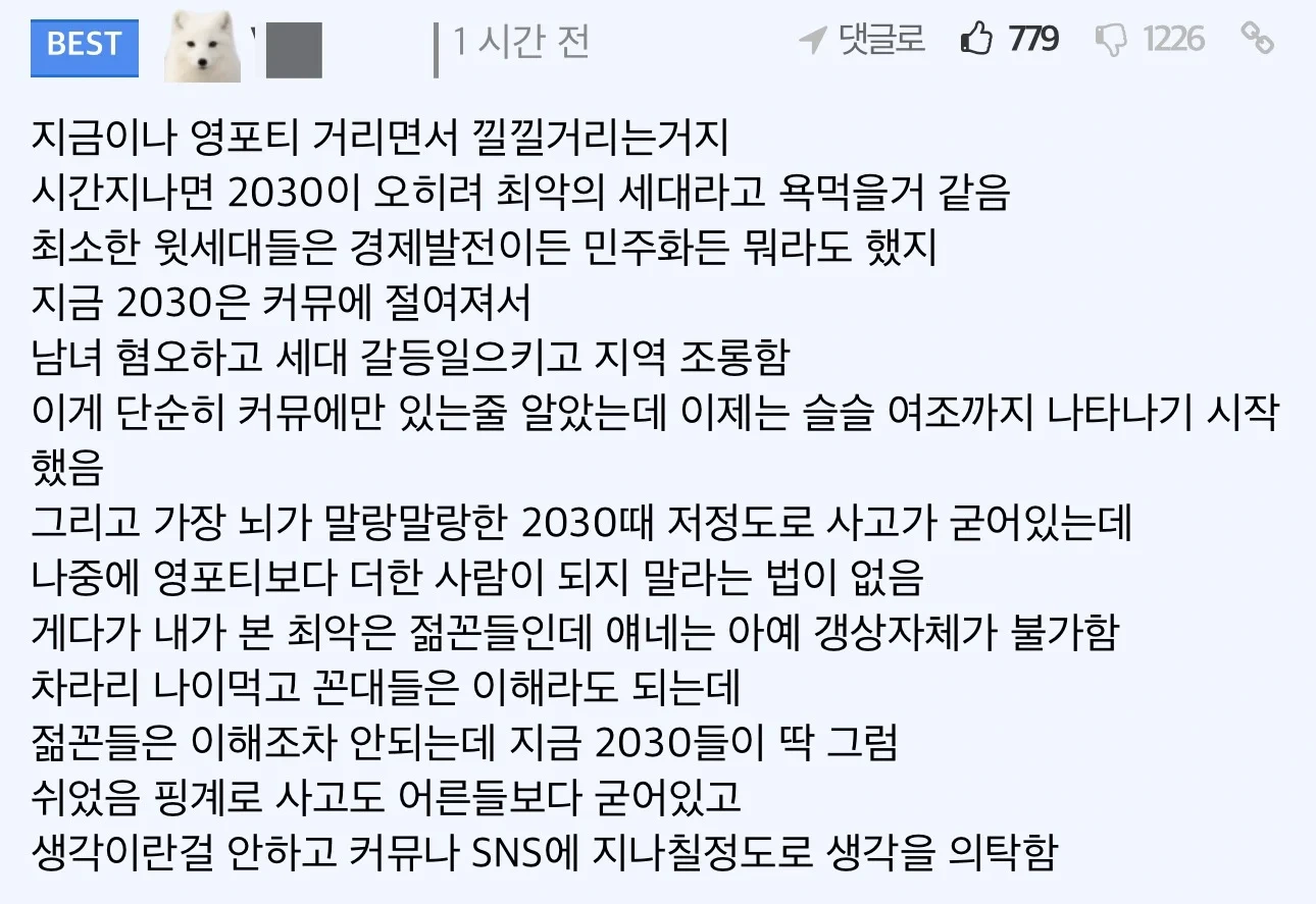 작성자kasiya84 작성시간 26.03.20 에혀.. 존나 걱정되긴함. 나라를 이끌어갈 재목들은 2030인데.. 우리같은 영감쟁이 들이야 꼰대건 나발이건 곧 역사의 뒤안길로 갈 양반들이고 젊은친구들은 정신 바짝차리고 살아도 살아질까 말까한 세상에서..참..쯥