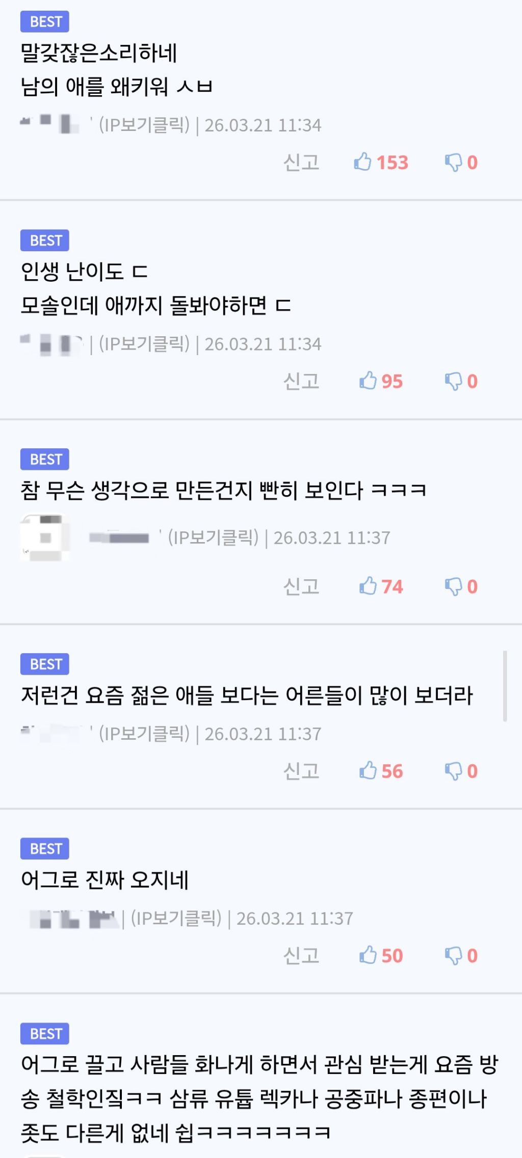 요즘 신박하게 나온 연애프로그램 작성자검성진산월02|작성시간26.03.22|조회수3,956 목록 댓글 8 글자크기 작게가 글자크기 크게가 정신나간듯..개욕 먹는중 다음검색 현재 게시글 추가 기능 열기 북마크 공유하기 신고 센터로 신고 댓글 댓글 8 댓글쓰기 답글쓰기 댓글 리스트 작성자reddevil20 | 작성시간 26.03.22 미쳐가는구나 작성자알았다 짜샤 | 작성시간 26.03.22 아마 돈 벌러 나간듯 -모솔 39년차- 작성자원빈을닮고원반이라읽는다 | 작성시간 26.03.22 일단 바이럴 성공!! 작성자자갈칭 | 작성시간 26.03.22 ㅋㅋㅋ신박하다 ㅋㅋ 작성자김극혐 | 작성시간 26.03.22 이혼한 남자는 자기 애도 안키우는데ㄷㄷ 댓글 전체보기
