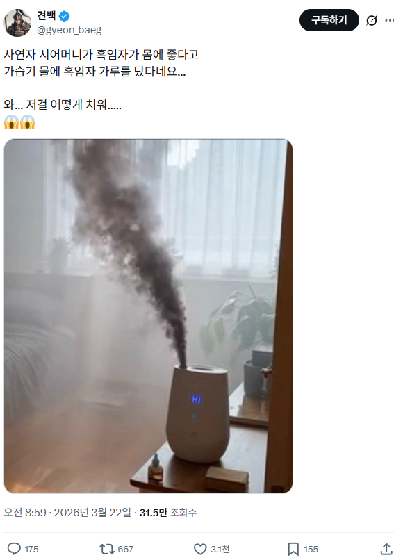 시어머니 때문에 대참사 난 가습기. 작성자자각몽6|작성시간26.03.22|조회수84,444 목록 댓글 3 글자크기 작게가 글자크기 크게가 다음검색 현재 게시글 추가 기능 열기 북마크 공유하기 신고 센터로 신고 댓글 댓글 3 댓글쓰기 답글쓰기 댓글 리스트 작성자enchantment | 작성시간 26.03.22 저거 ai로 만든 가짜영상으로 보면 티 확 남가루류는 저렇게 안 됨 답댓글 작성자북극성 | 작성시간 26.03.22 고부 갈라치기 ㄷㄷㄷ 작성자구루미러뷰 | 작성시간 26.03.31 임자~ 왜그랬어요? 댓글 전체보기