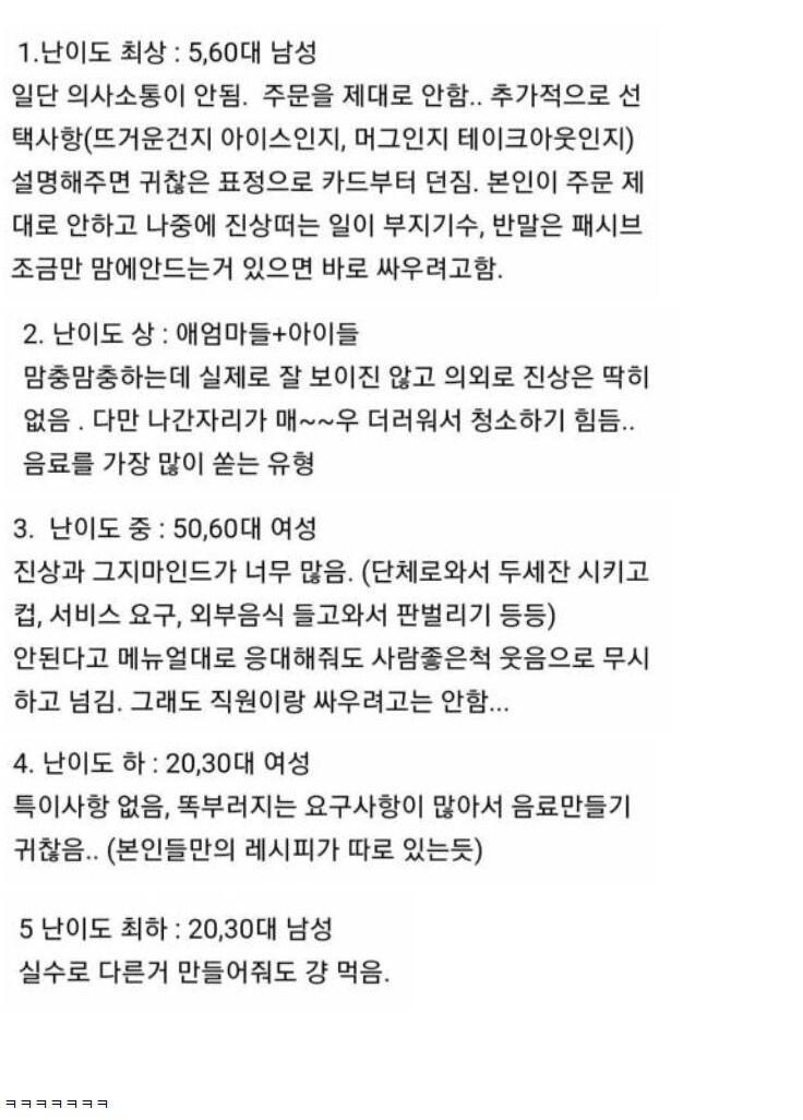 작성자Clazzi 작성시간 26.03.22 카페 10년차 손님 많은 매장이라서 사람들 상대 엄청 하는데 2,30대 남자들 진짜 편함. 그담이 20대 여자.. 10대들은 따로 시키는 경우가 많아서 은근 빡쎔.. 할매들 난이도 최상!! 그담이 아줌마들.. 할배들은 은근 괜춘함