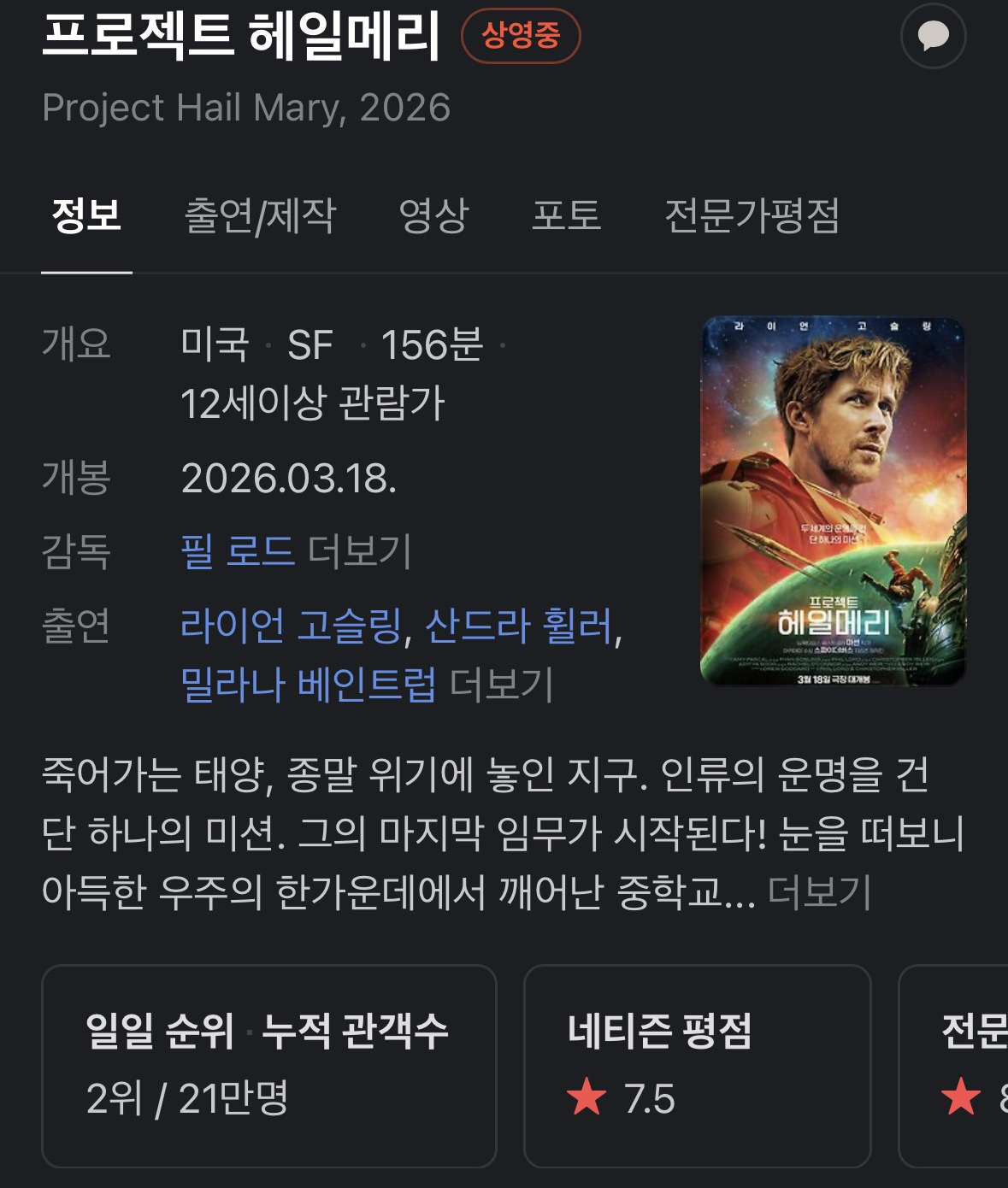 작성자백곰조련사 작성시간 26.03.23 아이들이랑 나중에 꼭 같이 다시 보고 싶네요. 어벤져스3이후 최고였던듯, 너무 재밌게 잘봣어요.