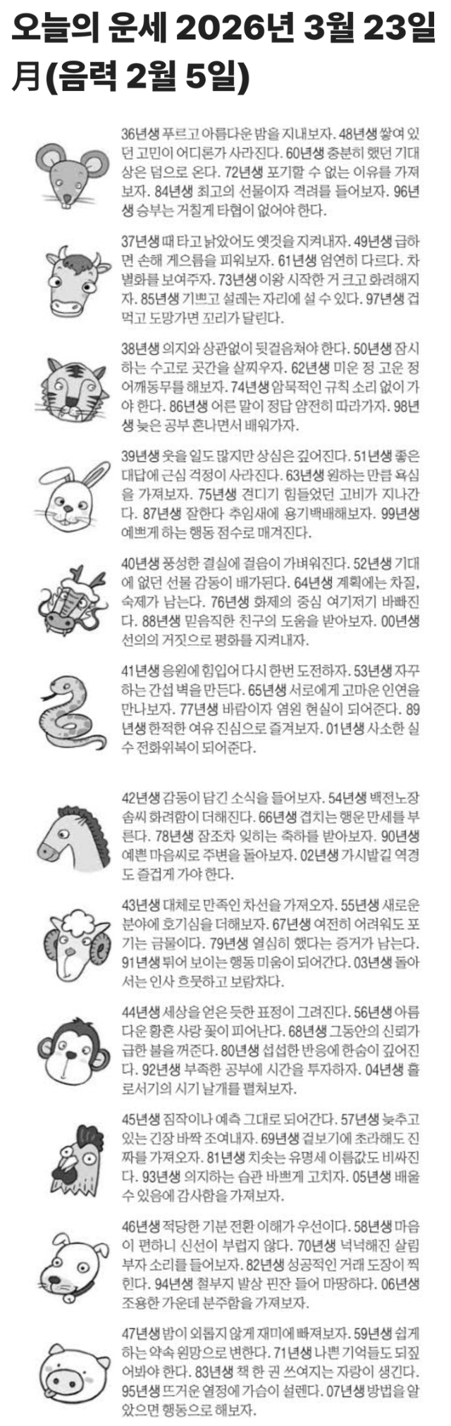 오늘의 운세 작성자fate2222|작성시간26.03.23|조회수4,193 목록 댓글 1 글자크기 작게가 글자크기 크게가 다음검색 현재 게시글 추가 기능 열기 북마크 공유하기 신고 센터로 신고 댓글 댓글 1 댓글쓰기 답글쓰기 댓글 리스트 작성자복사기 임대업자 | 작성시간 26.03.23 유명세에 비싸지는 이름값오늘은 즐기겠읍니다 댓글 전체보기