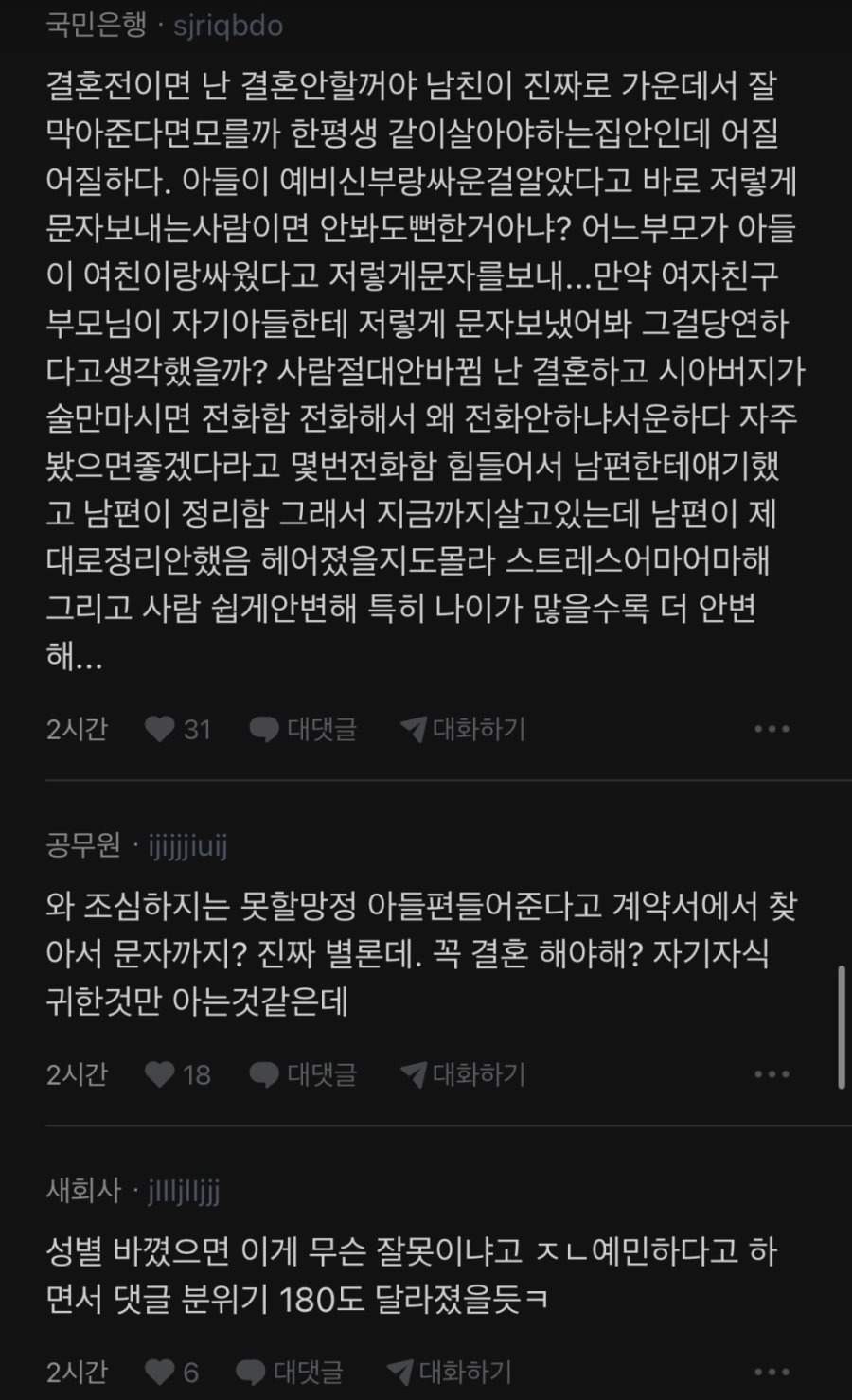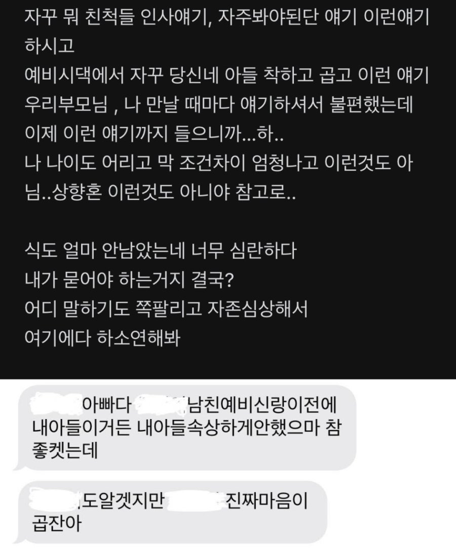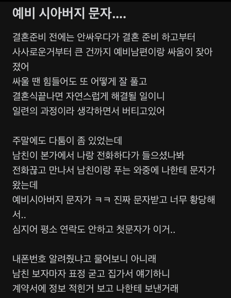 예비 시아버지의 문자를 받은 여자. 작성자자각몽6|작성시간26.03.25|조회수8,758 목록 댓글 30 글자크기 작게가 글자크기 크게가 다음검색 현재 게시글 추가 기능 열기 북마크 공유하기 신고 센터로 신고 댓글 댓글 30 댓글쓰기 답글쓰기 댓글 리스트 작성자폴지니어스 | 작성시간 26.03.25 런 작성자망태든홍두깨 | 작성시간 26.03.25 무조건 파혼. 작성자루돌프 삼슴코. | 작성시간 26.03.25 앞쪽만 보고 감동 울컥 준비하고 있었는데 ㅋㅋ 미췬 작성자유자광 | 작성시간 26.03.25 나이를 똥구멍으로 쳐 먹었나... 작성자연천고라니 | 작성시간 26.03.25 저런거 뭐 필요 없어요 요즘 결혼 많이 하고 출산율 잘 오르고 있음. 댓글 전체보기