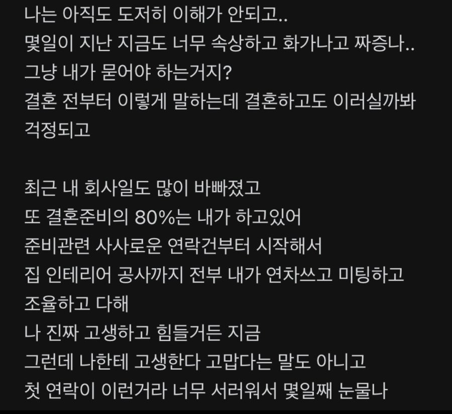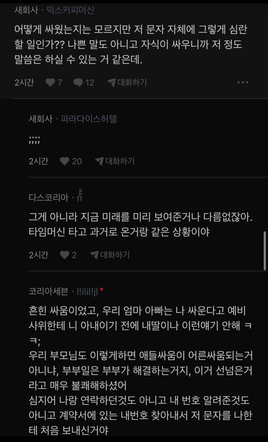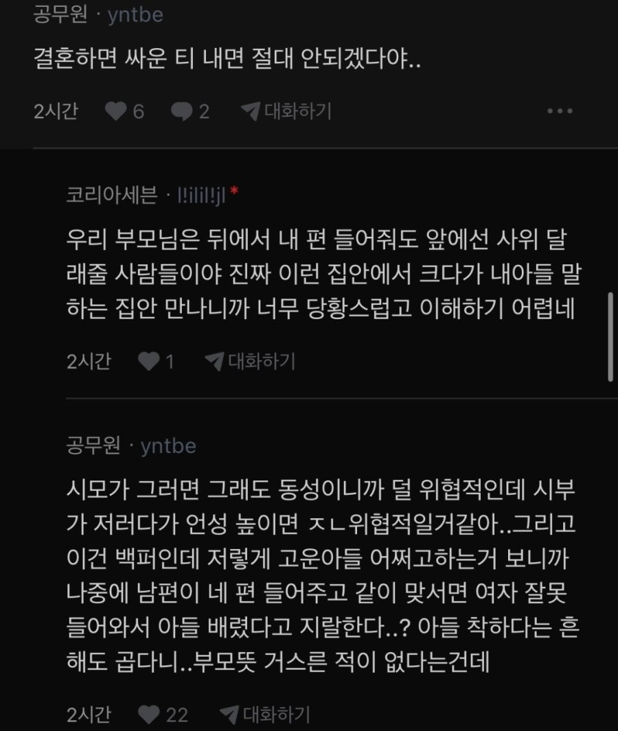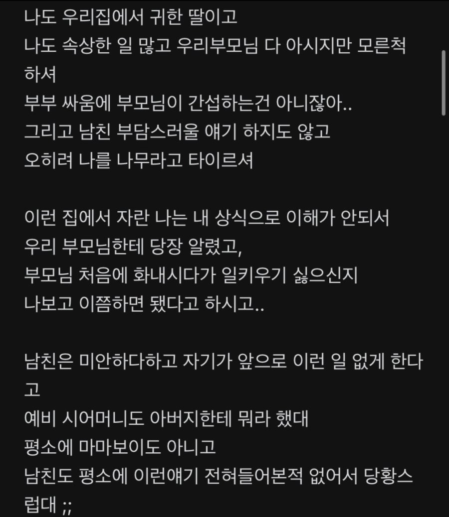 예비 시아버지의 문자를 받은 여자. 작성자자각몽6|작성시간26.03.25|조회수8,758 목록 댓글 30 글자크기 작게가 글자크기 크게가 다음검색 현재 게시글 추가 기능 열기 북마크 공유하기 신고 센터로 신고 댓글 댓글 30 댓글쓰기 답글쓰기 댓글 리스트 작성자폴지니어스 | 작성시간 26.03.25 런 작성자망태든홍두깨 | 작성시간 26.03.25 무조건 파혼. 작성자루돌프 삼슴코. | 작성시간 26.03.25 앞쪽만 보고 감동 울컥 준비하고 있었는데 ㅋㅋ 미췬 작성자유자광 | 작성시간 26.03.25 나이를 똥구멍으로 쳐 먹었나... 작성자연천고라니 | 작성시간 26.03.25 저런거 뭐 필요 없어요 요즘 결혼 많이 하고 출산율 잘 오르고 있음. 댓글 전체보기