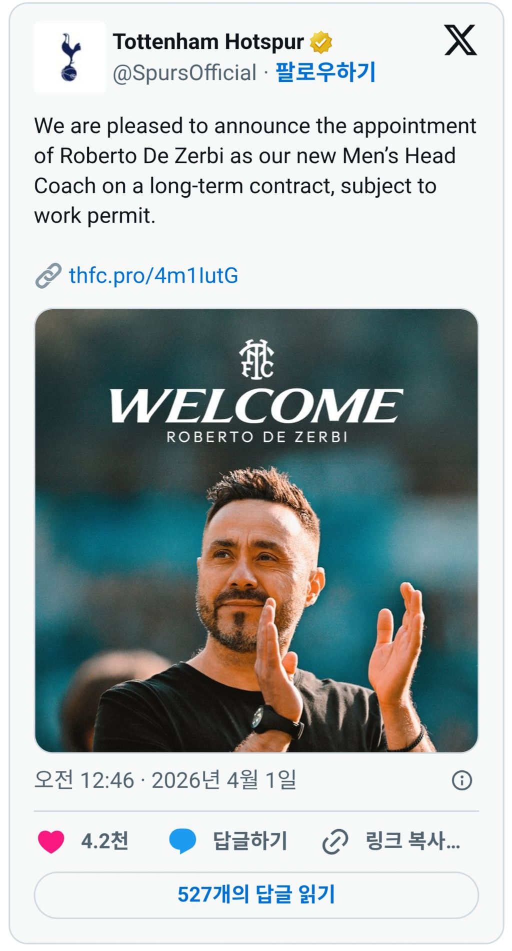 새로운 사령탑, 로베르토 데 제르비 감독을 환영합니다! 구단은 데 제르비 감독과 장기 계약을 체결했으며, 워크 퍼밋이 승인되는 대로 정식 부임할 예정입니다