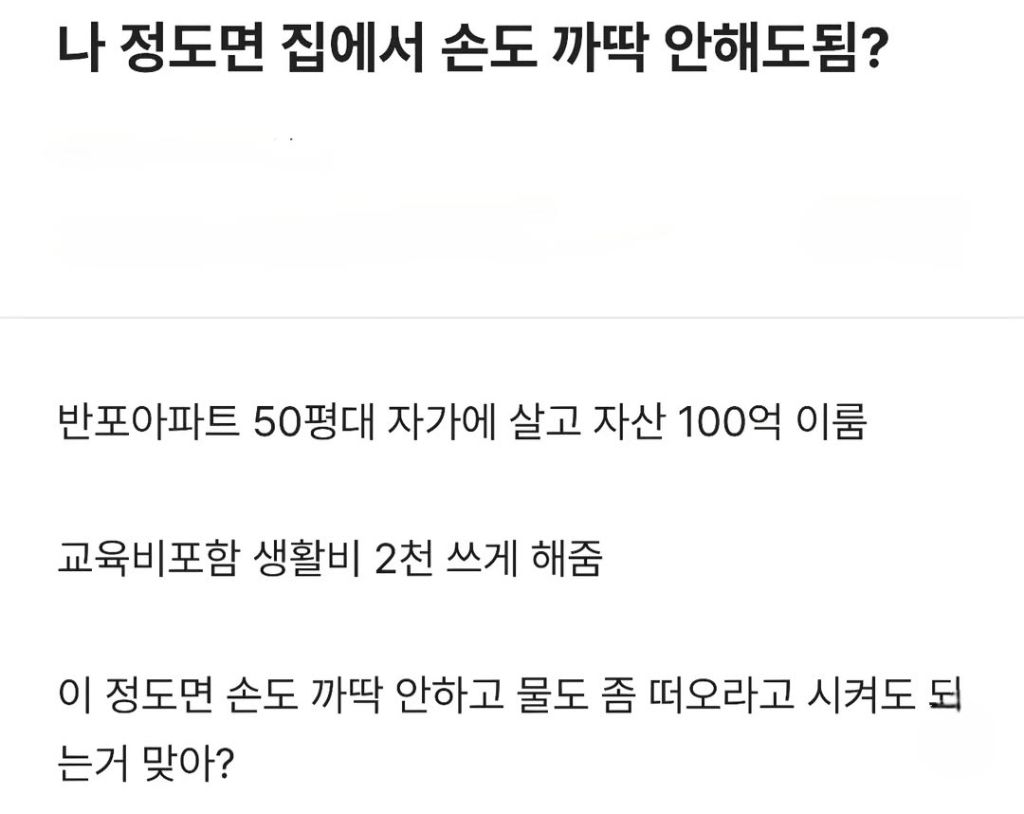 답댓글 작성자짱구짱구짱구 작성시간 26.04.02 22222. 딸은 발레하고 아들은 성악할 경우 남편이 2000주면 마누라가 본가에서 돈 빌려와야 함.