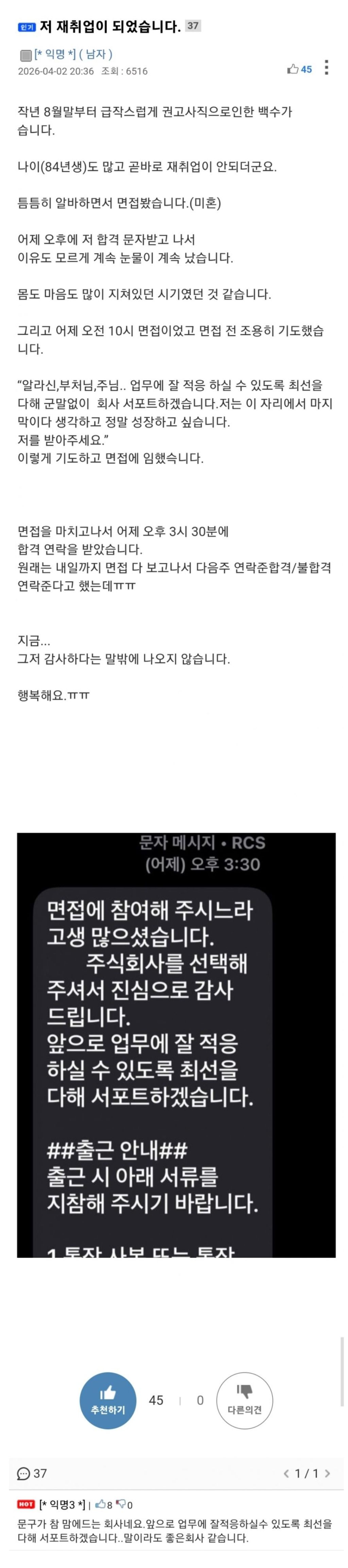 재취업이 되었습니다 작성자다크토바코|작성시간26.04.03|조회수3,399 목록 댓글 6 글자크기 작게가 글자크기 크게가 다음검색 현재 게시글 추가 기능 열기 북마크 공유하기 신고 센터로 신고 댓글 댓글 6 댓글쓰기 답글쓰기 댓글 리스트 답댓글 작성자취업준비생 | 작성시간 26.04.03 음….. 답댓글 작성자No pain, No gain | 작성시간 26.04.03 취업준비생 채용좀요 작성자Triple H | 작성시간 26.04.03 나도ㅠ 답댓글 작성자No pain, No gain | 작성시간 26.04.03 채용좀뇨 작성자호랭이소나무 | 작성시간 26.04.03 와 멋져 댓글 전체보기