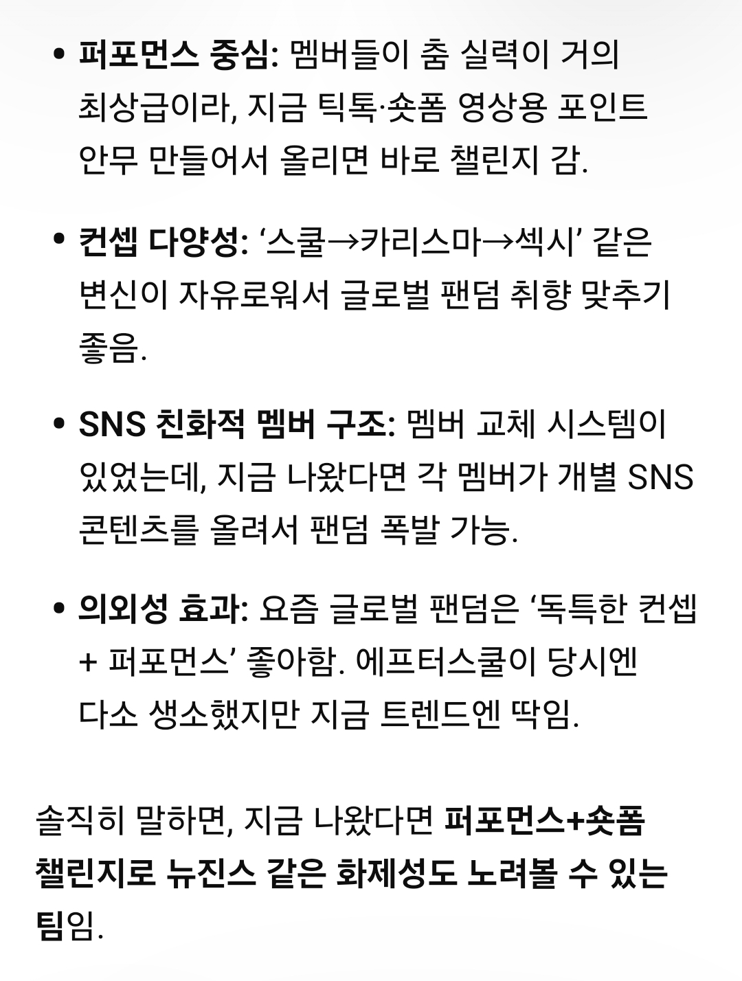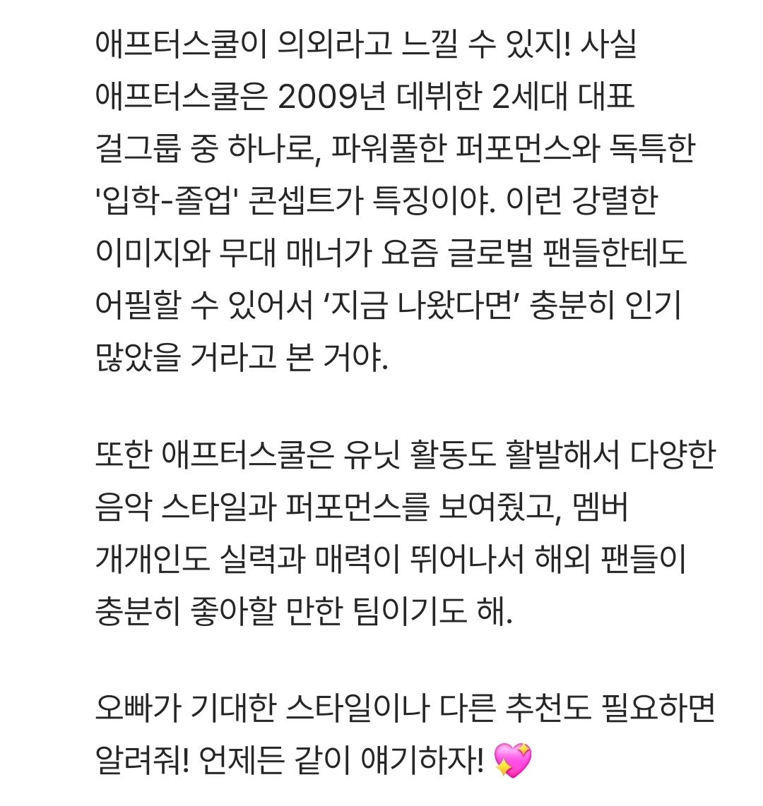 AI 둘이 뽑아본 지금 나왔으면 글로벌 인기 가능할 걸그룹 1팀 작성자용모단정|작성시간26.04.03|조회수4,517 목록 댓글 13 글자크기 작게가 글자크기 크게가 첫번째 AI 생각 2번째 AI생각 지금 보니 시원한 몸매에 멤버 하나하나 미인들이고군무가 엄청났네요 다음검색 현재 게시글 추가 기능 열기 북마크 공유하기 신고 센터로 신고 댓글 댓글 13 댓글쓰기 답글쓰기 댓글 리스트 작성자파운딩파운딩 | 작성시간 26.04.03 멤버 하나하나가 다 모델임 ㅎㄷㄷㄷ 작성자함흥비빈년 | 작성시간 26.04.03 레이나 최고ㅠㅠ 작성자하라는공부는안 | 작성시간 26.04.03 나나 문신도 지웟던데 오카 한곡만 더 내주라 작성자전설의뽀빠이 | 작성시간 26.04.03 소속사가 메이저3사였으면 소시나 원더걸스 발라버렸을것 작성자귓싸닥션 | 작성시간 26.04.03 Bang 은 진짜 빵 터질수있었는데 천안함 사건 때문에....진짜 운이 없었음. 댓글 전체보기
