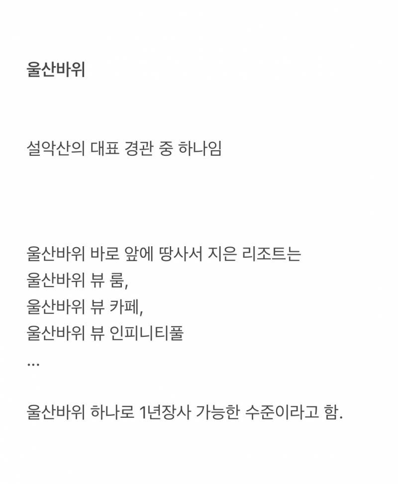 현재 바위 하나로 장사한다는 K-리조트. 작성자자각몽6|작성시간26.04.03|조회수63,641 목록 댓글 25 글자크기 작게가 글자크기 크게가 다음검색 현재 게시글 추가 기능 열기 북마크 공유하기 신고 센터로 신고 댓글 댓글 25 댓글쓰기 답글쓰기 댓글 리스트 작성자좋은사람..!! | 작성시간 26.04.03 근처 캠핑장에서 봐도 좋더라구요 이미지 확대 답댓글 작성자진지인 | 작성시간 26.04.04 오호 같은곳인듯요! 이미지 확대 작성자니가가라모히또 | 작성시간 26.04.03 재작년에 갔을땐 널널했는데 ㄷㄷㄷ 작성자monga | 작성시간 26.04.03 작년 날씨 흐린날 가니깐 생각보담 ㅠ 7시간 차타고 갔더니 안개때문에 망했던....고성 금강산, 언젠가 다시한번 도전해 봐야죠 작성자부들보들 | 작성시간 26.04.03 여기 골프장 그린피 얼마나 할려나.. 댓글 전체보기