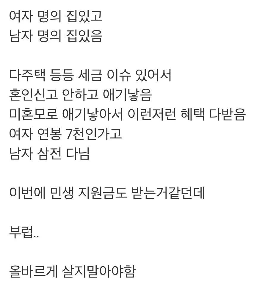 작성자결빈서율이아빠 작성시간 26.04.04 저거 사실일겁니다. 4남매 키우는데 어딘지 말은 못하지만 휴대폰 상담받으러 갔는데 요즘 위장이혼으로 휴대폰 요금혜택등 많은 걸 받아가니 그렇게 하라고... 미친놈인가 했어요. 그냥 나왔습니다.