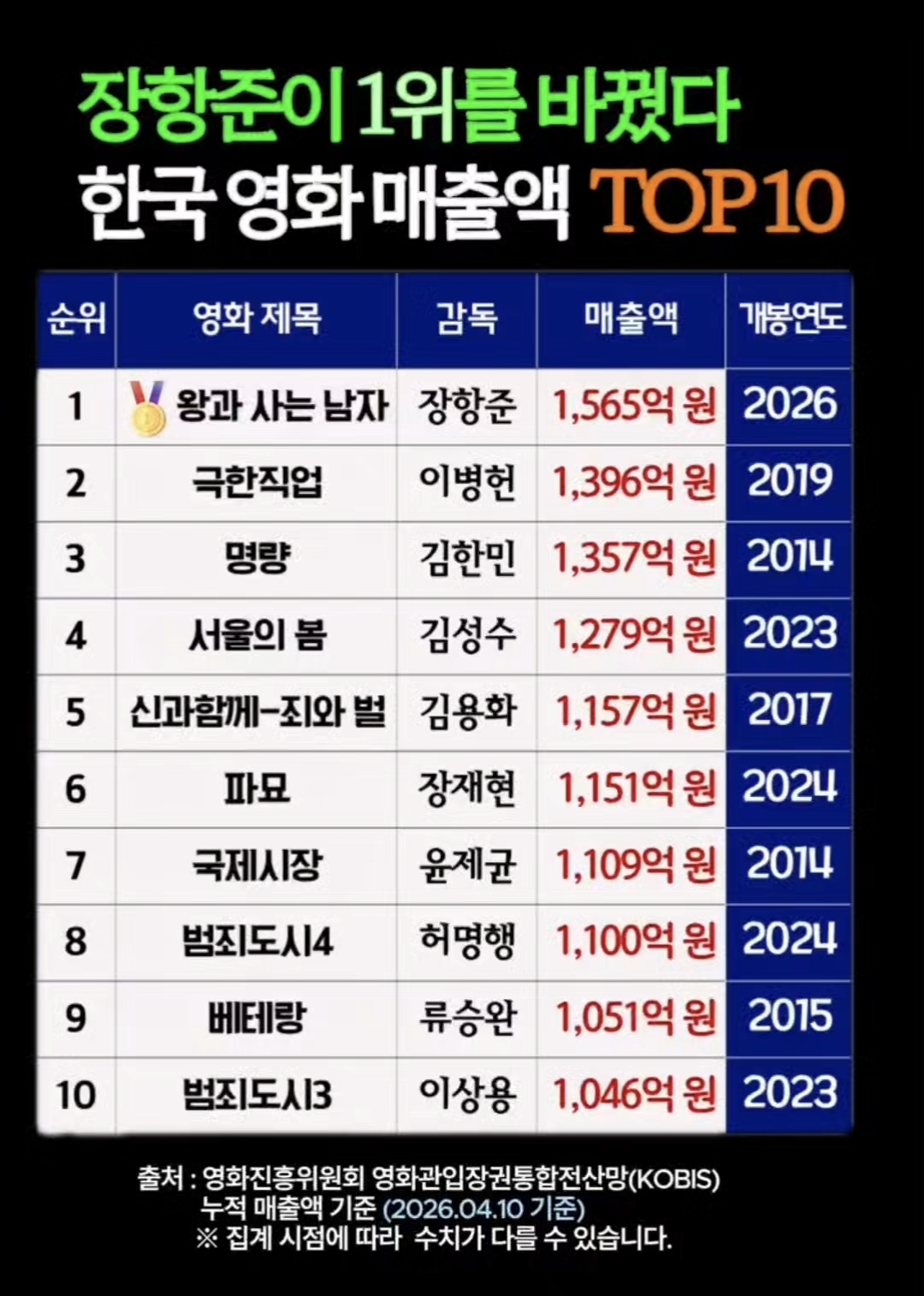 왕과사는남자 한국 영화 매출액 1위 등극 작성자님아그선을넘지마|작성시간26.04.12|조회수9,607 목록 댓글 9 글자크기 작게가 글자크기 크게가 다음검색 현재 게시글 추가 기능 열기 북마크 공유하기 신고 센터로 신고 댓글 댓글 9 댓글쓰기 답글쓰기 댓글 리스트 작성자끝없는자극 | 작성시간 26.04.12 시리즈물이 알짜구나 답댓글 작성자후이즈피터 | 작성시간 26.04.12 근데 시리즈물을 못 만듦 ㅠ 작성자Deadman_working | 작성시간 26.04.12 제작비대비 수익은 다른 영화대비 초대박일듯 작성자채플힐 | 작성시간 26.04.12 1위영화에 호랑이 cg는 너무큰 에러네ㅋㅋㅋㅋ 작성자마음을 불태워라! | 작성시간 26.04.12 왕사남만 안봤네 댓글 전체보기