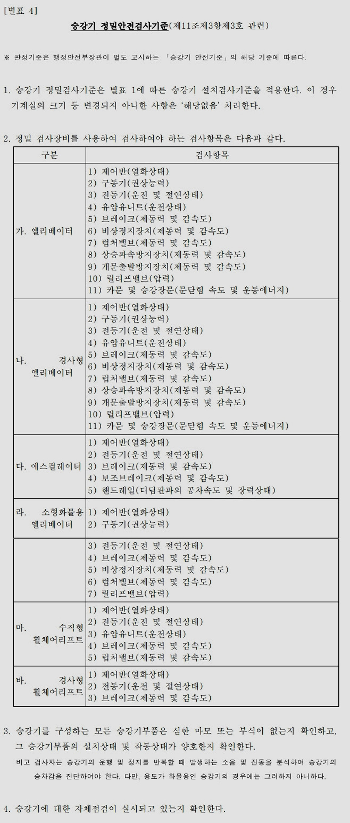 ② 제1항에도 불구하고 종전의 완성검사를 받은 날부터 21년이 지나 정밀안전검사를 세 번째 받는 승강기(주택용 엘리베이터는 제외한다)의 경우로서 다음 각 호의 구분에 따른 승강기부품 또는 장치에 관한 정밀안전검사의 판정기준은 별표 4의 개정규정을 따른다.