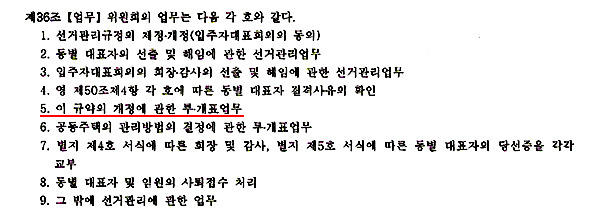 보충설명 : 그럼“ 입주자등의 과반수가 찬성하는 방법”이라 하였데, 서명동의와는 다른 방법 즉 주택법시행령 부칙<대통령령 제24307호, 2023.1.9> 제6조에 의한 서울시 관리규약 준칙, 우리 관리규약 제36조제5항에 명시된 방법이 선거관리위원회의 업무로 “이 규약의 개정에 관한 투.개표업무”라고 분명 명문화되어 있음.