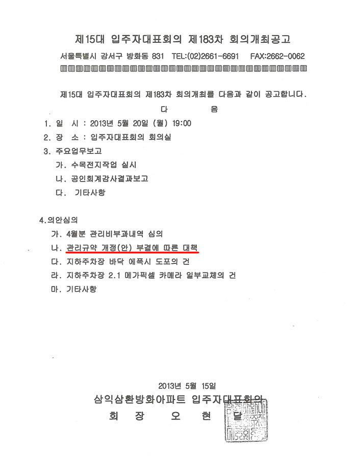 금번 2013.5.6.일 관리규약 개정(안)이 부결되어 5.20일 이에 대한 대책회의가 있다고 공고 되었습니다.
