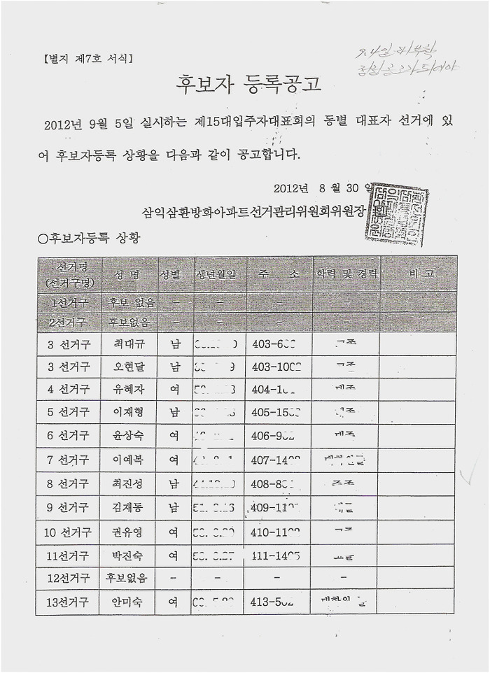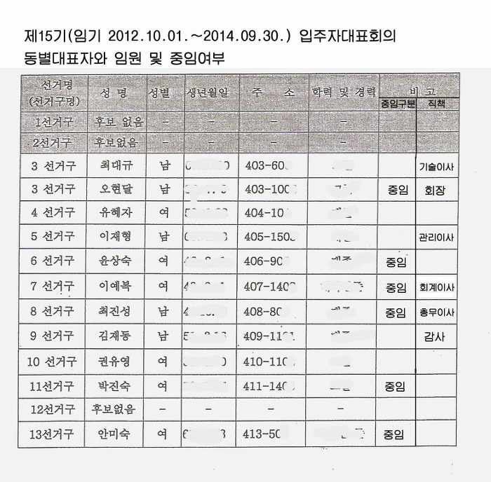* 이자료는 선거관리위원회에서 2012.8.30일자 제15기 입주자대표회의 동별대표 후보자 등록공고한 내용에 중임구분과 직책을 추가하여 작성한 자료임.