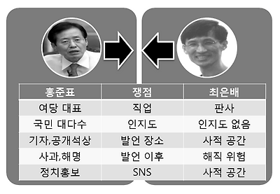 홍준표 대표는 부적절한 발언이었다고 해명하고 사과하면 끝이었지만 최은배 판사는 지금 직장을 잃게 될 위험에 처해 있습니다. 여기에 최은배 판사는 SNS를 진짜 사적인 공간으로 활용했지만 홍준표 대표는 자신의 정치 홍보를 위해서만 사용했습니다.