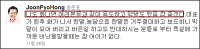 홍준표 한나라당 대표는 트위터에 ‘나도 화나면 여러분들과 같이 욕도 하고 막말도 했음 참 좋겠다’라는 글을 올리면서 자신의 말과 최은배 판사의 글에 대한 논란을 비교했습니다. 그러나 홍준표 컴맹당(이라고 쓰고 무뇌아당이라고 읽으세요) 대표님은 전혀 사건의 본질과 SNS의 성격을 파악하지 못하고 있습니다.