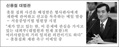 신용철 대법관은 촛불집회 당시 서울중앙지법 법원장으로 재직했습니다. 그는 당시 형사 단독판사에게 배정된 촛불집회 사건을 빨리 현행법대로 처리하라고 메일을 보냈습니다. 그뿐만 아니라 전화에 회식자리에서 공공연히 말을 하고 다녔습니다.