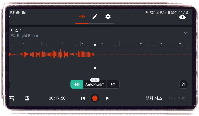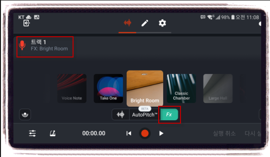 오늘은 일단, 목록 중에서 가장 작은 리버브 효과(Bright Room)를 적용해 봤습니다..^^ 효과를 적용하시면.. 위 사진의 "트랙1" 부분에 "FX:Bright Room" 적용된 FX 효과의 이름이 표기됩니다. 결과는 녹음 후에 확인하시면 되겠습니다.. 만일 잔향 효과가 미미하다면 좀 더 센 것(?)으로 적용해보시면서 최적치를 찾으시면 됩니다..^^