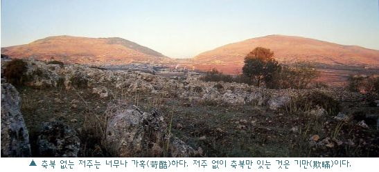 에발산에 오르며 축복 받을 수 없고, 그리심 산에 오르며 저주 받을 수 없다. 하나님 말씀에 불순종하며 축복받으려고 하지 말아야 한다. 반대로 하나님 말씀에 순종하는 자로 아무리 저주하려해도 저주 받을 수 없음은 그가 그리심산에 있기 때문이다. 이 기본적 원리를 깨달아야 한다. 신명기는 전체가 이 원리를 설명한 책이다. 에발산에서 축복 받기를 애타게 소원해도 그 곳은 축복을 외치는 곳이 아니기 때문에 그것은 불가능한 것이다. 그건 똥간에 사는 쥐새끼가 깨끗하기를 바라는 것과 비슷하다.