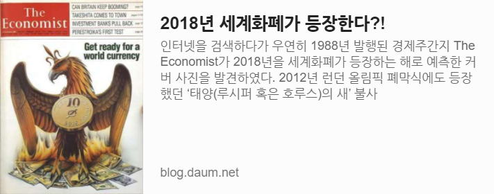 인터넷을 검색하다가 우연히 1988년 발행된 경제주간지 The Economist가 2018년을 세계화폐가 등장하는 해로 예측한 커버 사진을 발견하였다.