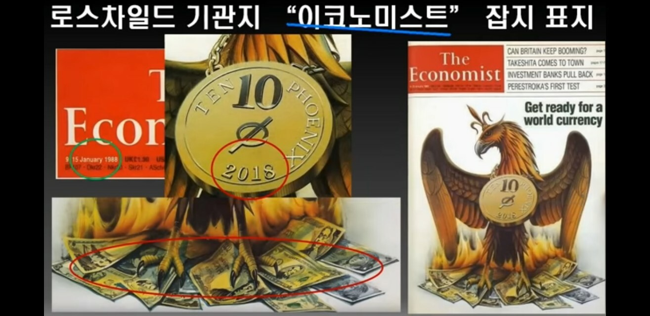 2012년 런던 올림픽 폐막식에도 등장했던 ‘태양(루시퍼 혹은 호루스)의 새’ 불사조(Phoenix)가 불탄 각국의 화폐 위에 세계화폐로 부활하는 모습이 그려져 있다.