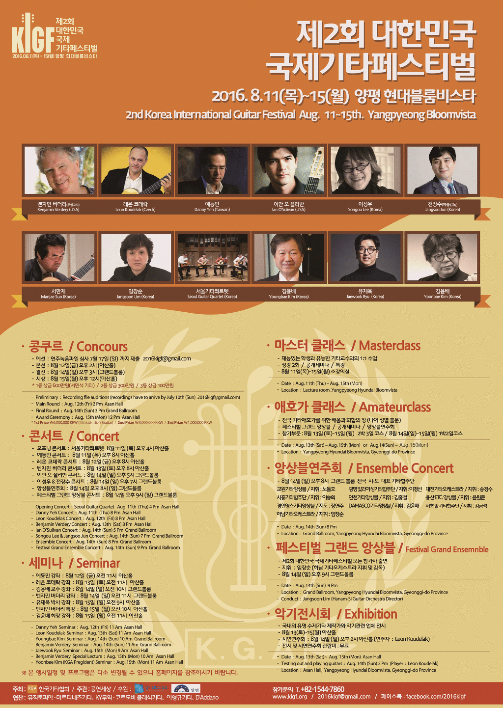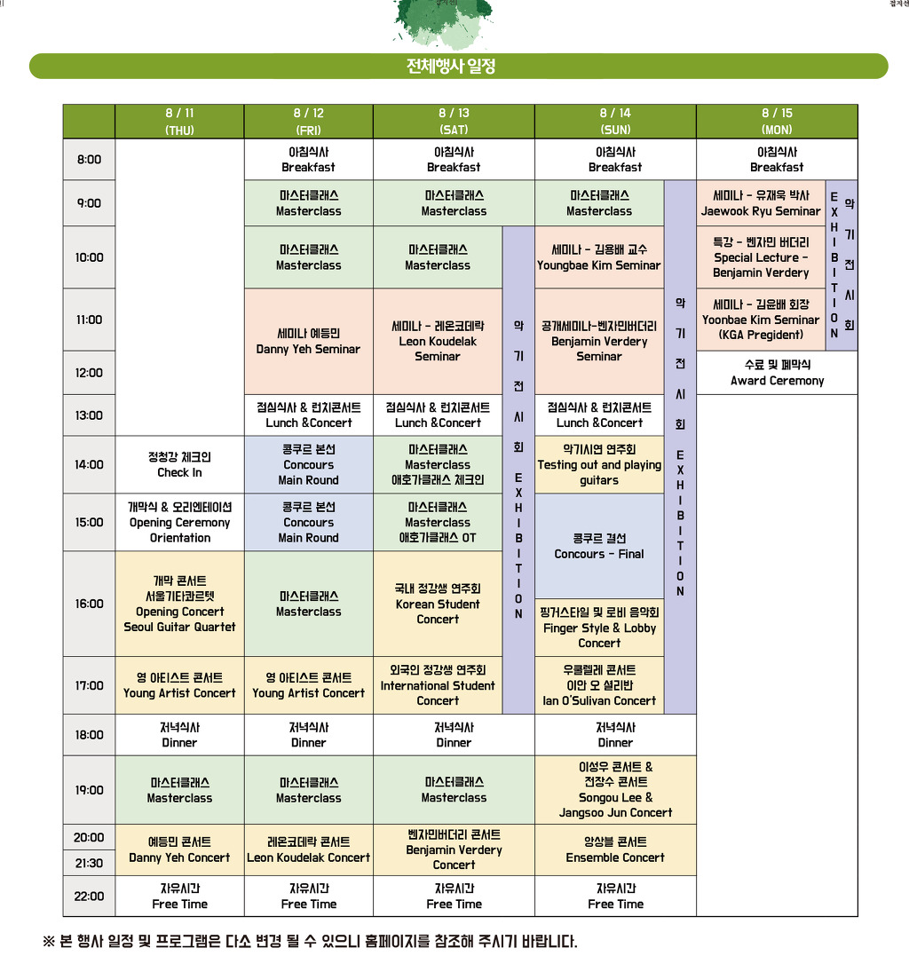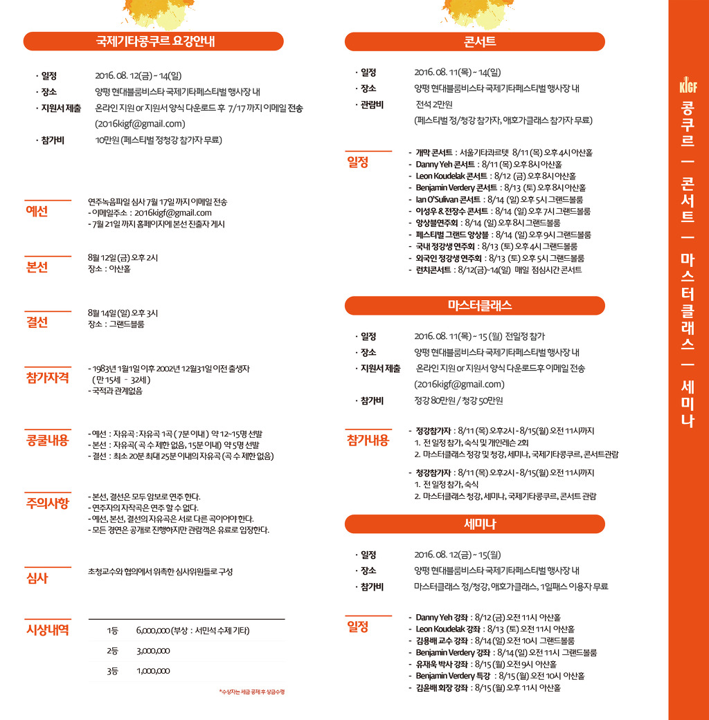 국제기타콩쿠르, 콘서트, 마스터클래스, 세미나, 애호가클래스, 앙상블 연주회, 페스티벌 그랜드 앙상블, 악기전시회
