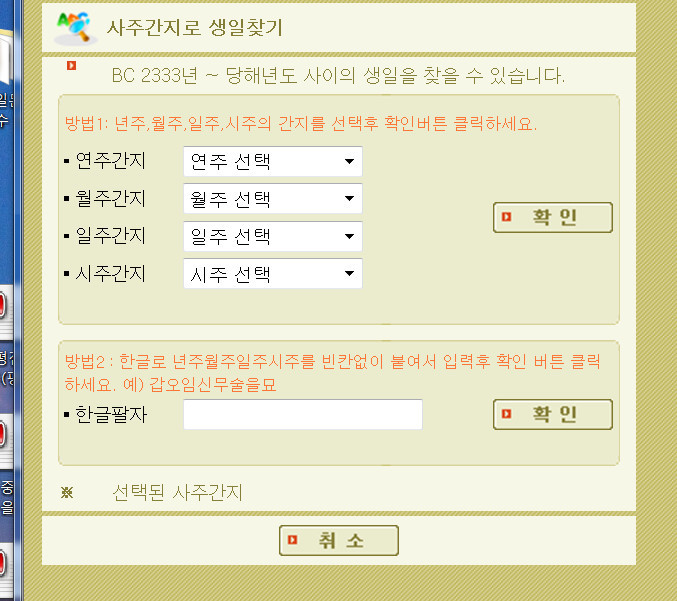 <사주 간지>로 <생년월일시>를 찾는 곳입니다. (도사폰) 작성자그리다(삼성문의소)|작성시간16.09.02|조회수664 목록 댓글 0 글자크기 작게가 글자크기 크게가 http://www.sajulink.com/ssMain/cal_1.jsp <사주 간지>로 <생년월일시>를 찾는 곳입니다. 들어가셔서 <사주간지로 생일 찾기>를 누르시면 됩니다.도사폰입니다 다음검색 현재 게시글 추가 기능 열기 북마크 공유하기 신고 센터로 신고 댓글 댓글 0 댓글쓰기 답글쓰기 댓글 리스트